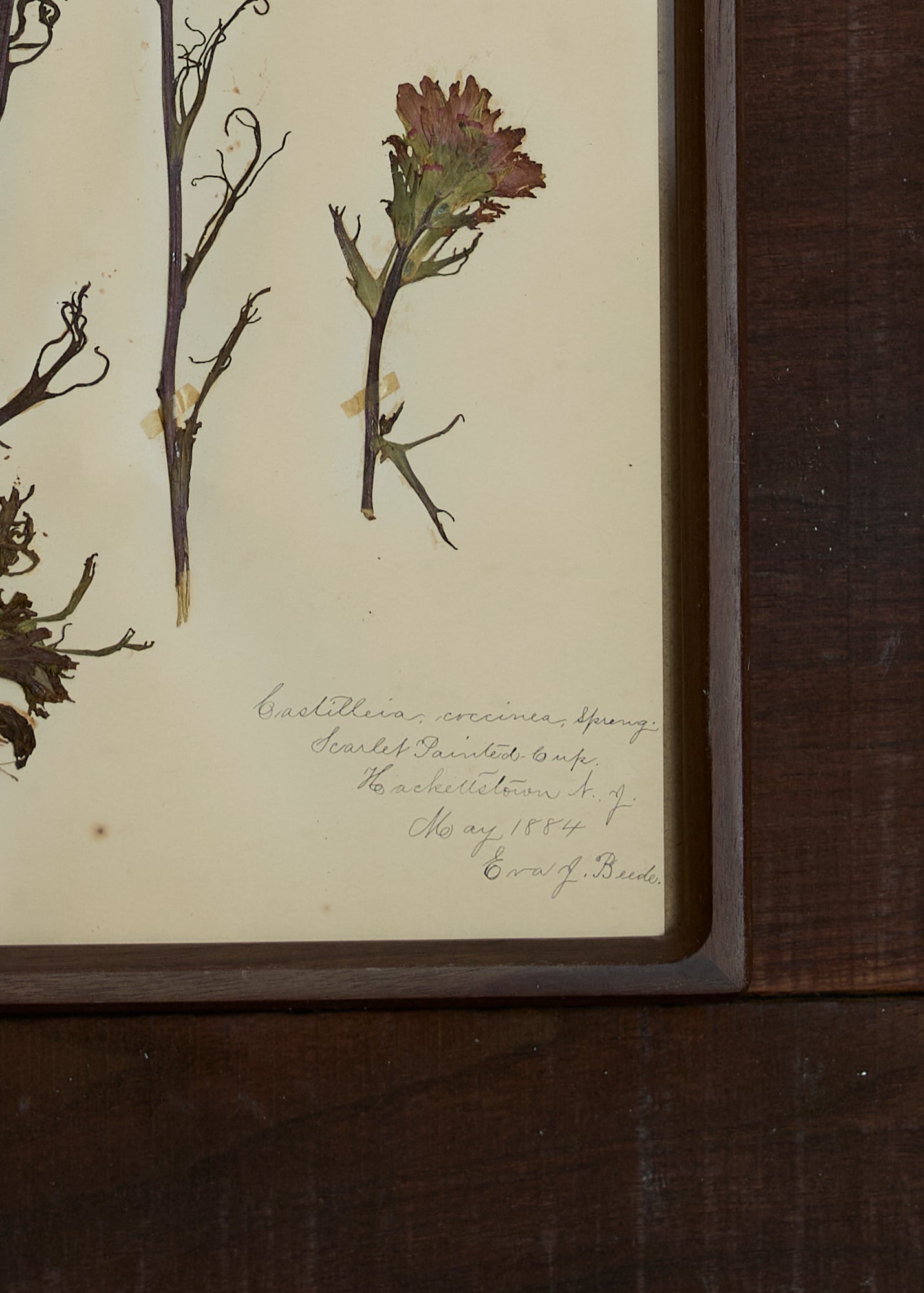 These botanical pressings were collected by Eva Beede Odell in the 1880's; each pressing is dated with the name of the plant species and the location where Eva collected the specimen. The pressings have all been carefully framed in gorgeous solid walnut frames that are ready for hanging. Each framed pressing includes a typed description about the origin of the pressings and a bit about Eva herself.