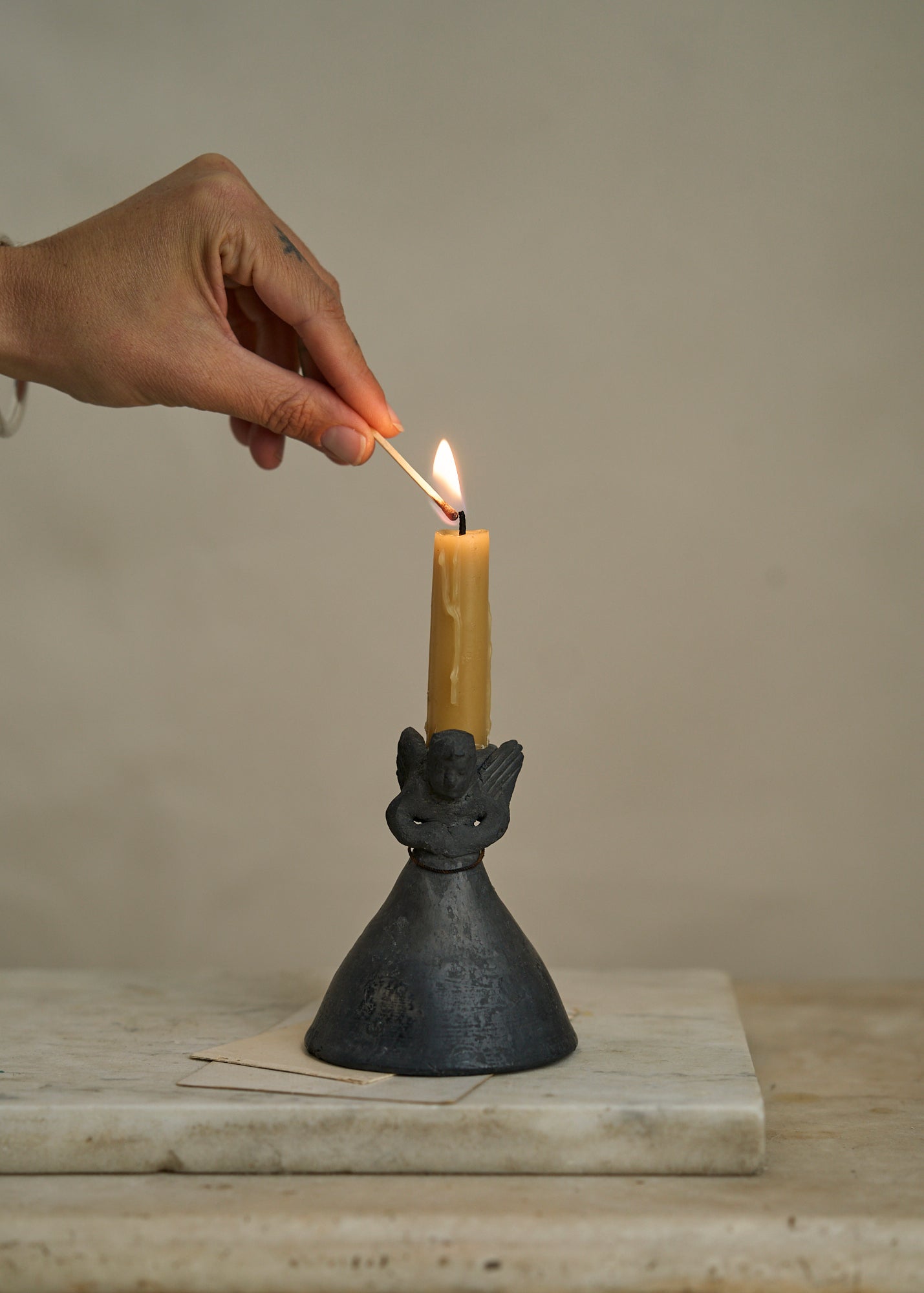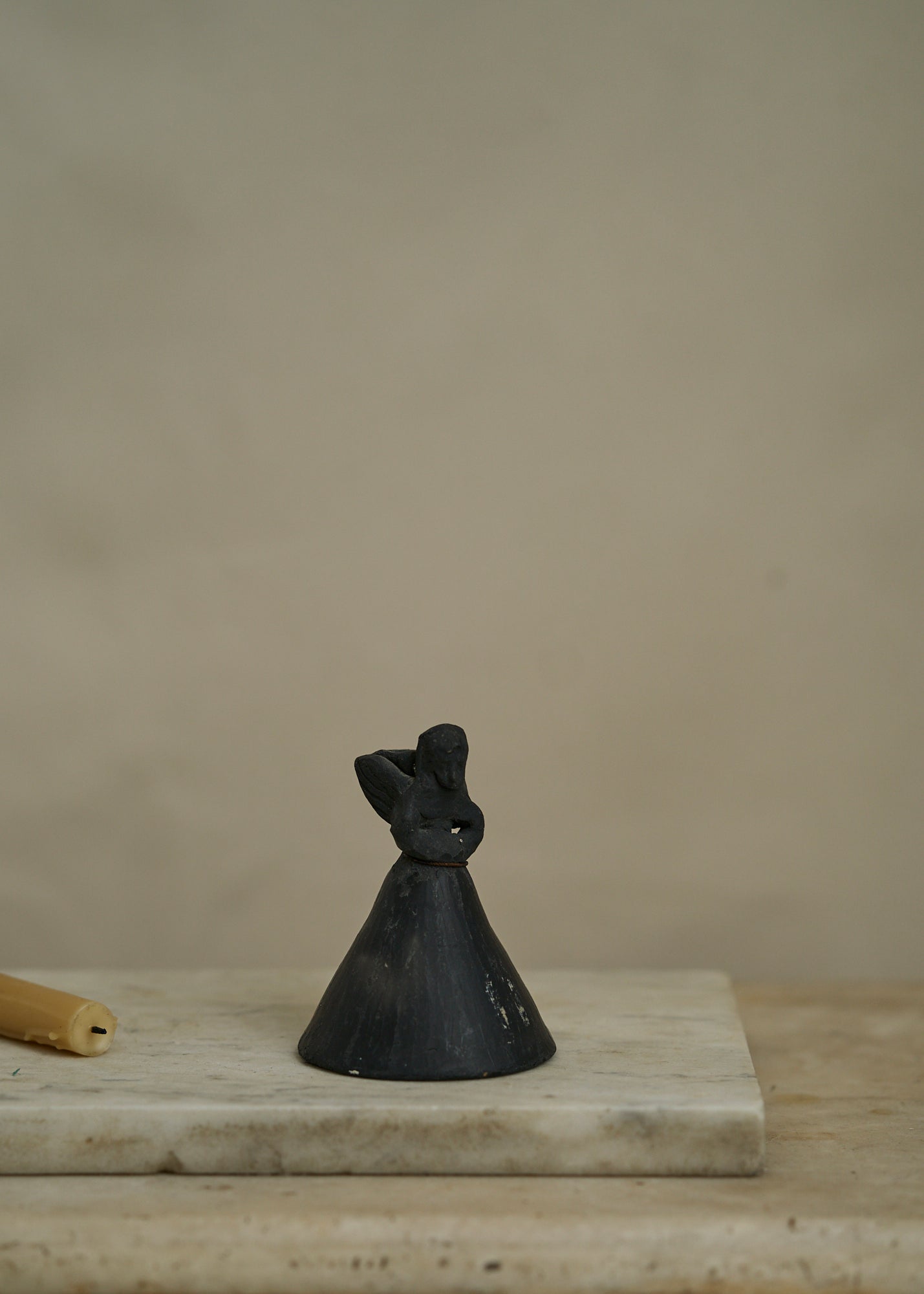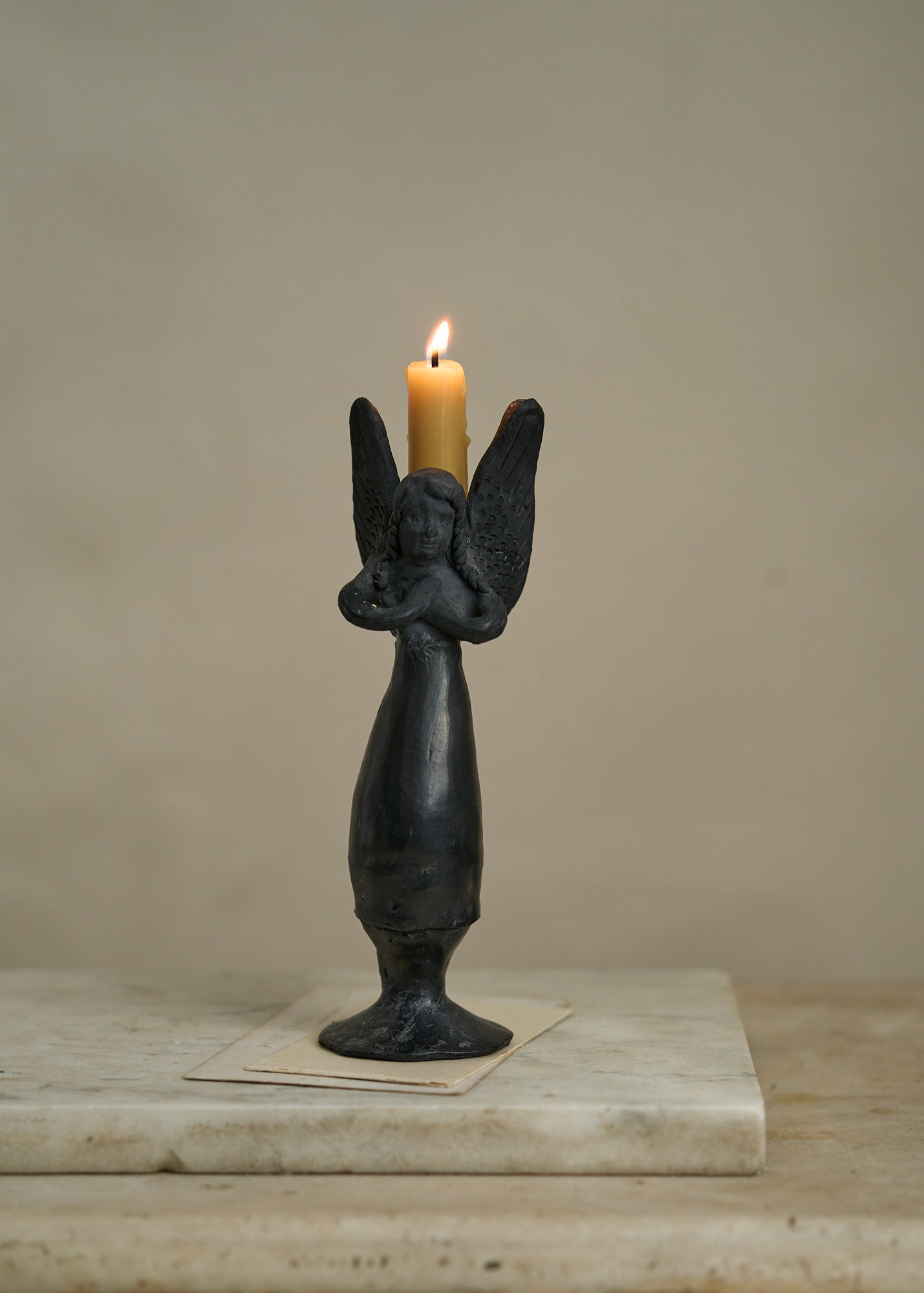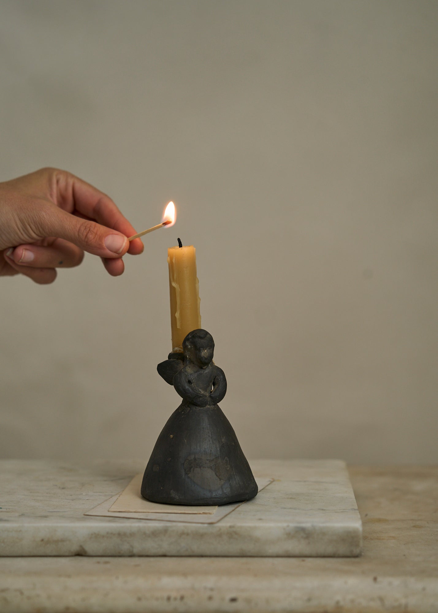 A collection of antique Mexican ceramic cherubs dating from the 1940's - 1960's. These barro negro pieces were made by artisans out of Oxacan black clay, a material this region of Mexico has been known for throughout history. Some of these pieces double as bells and candleholders, while others are one or the other. We sourced this collection of special cherubs with holiday decor in mind.