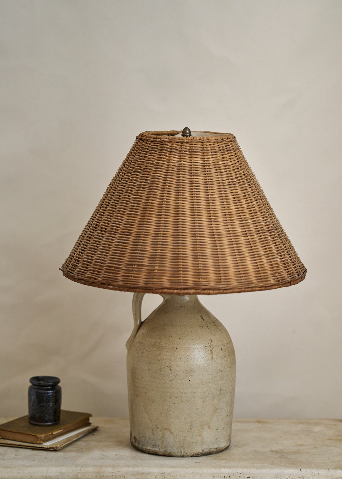 An antique stoneware jug has been transformed into a gorgeous table lamp. Woven rattan shade. Tested and works perfectly.