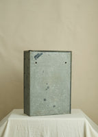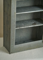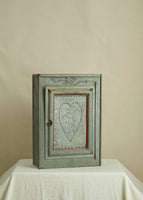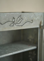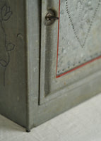 A gorgeous hand pinched tin wall cabinet or bread box circa 1950 with heart and flowers motif. Interior shelves and a metal lid that you can open from the top. Front door latches closed. Perfect to mount on the wall and use as bathroom storage or use in the kitchen to store your fresh baked breads and treats.