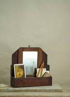 Folk art handmade wooden wall caddy featuring a small mirror. A great place to store keys and small items next to the front door or for wall storage in a cottage bathroom.