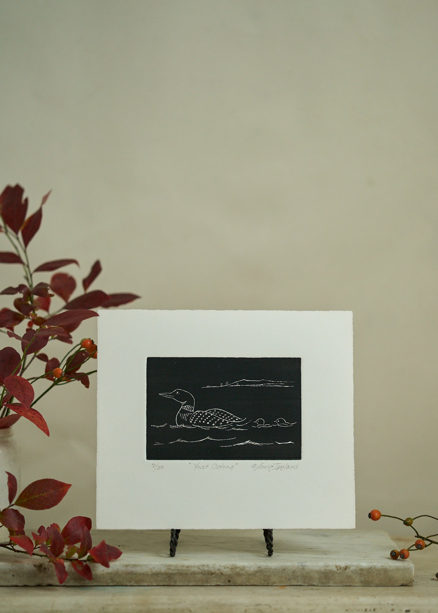 A mid century print of an engraving by Massachusetts artist Anne Ireland depicting loons she observed on a New England lake. Anne never sold her work publicly, these pieces are from her private collection. She was a textile designer who was active in her local artists guilds and historical societies.