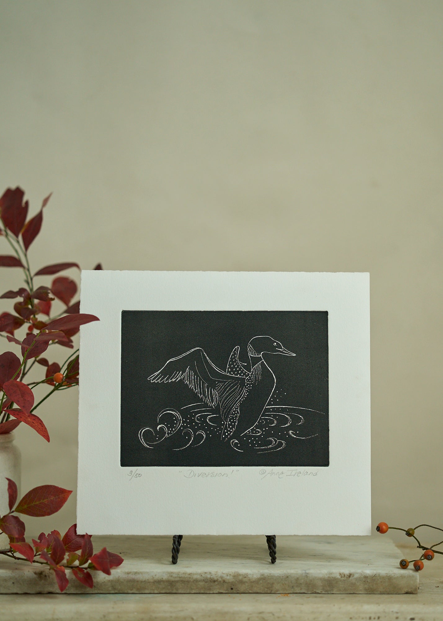 A mid century print of an engraving by Massachusetts artist Anne Ireland depicting loons she observed on a New England lake. Anne never sold her work publicly, these pieces are from her private collection. She was a textile designer who was active in her local artists guilds and historical societies.