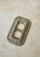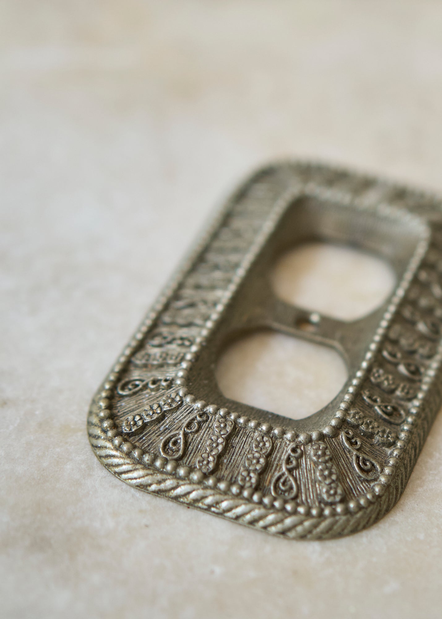 I love finding vintage fixtures like outlet and switch plate covers that are an easy, low cost way to add an interesting detail to your home. This mid century metal ornate outlet cover was made by the American Tack & Hardware Co.