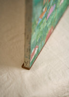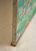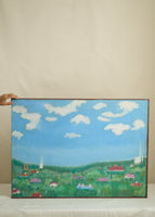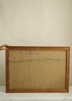 Mid century oil painting titled, 'A View in Westchester'. Wood frame is missing one side panel.