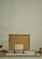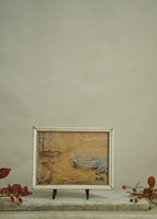 1940's era painting of a lakeshore featuring a cabin and boat. Vintage white wood frame. Artist mark (faded) on back of piece.