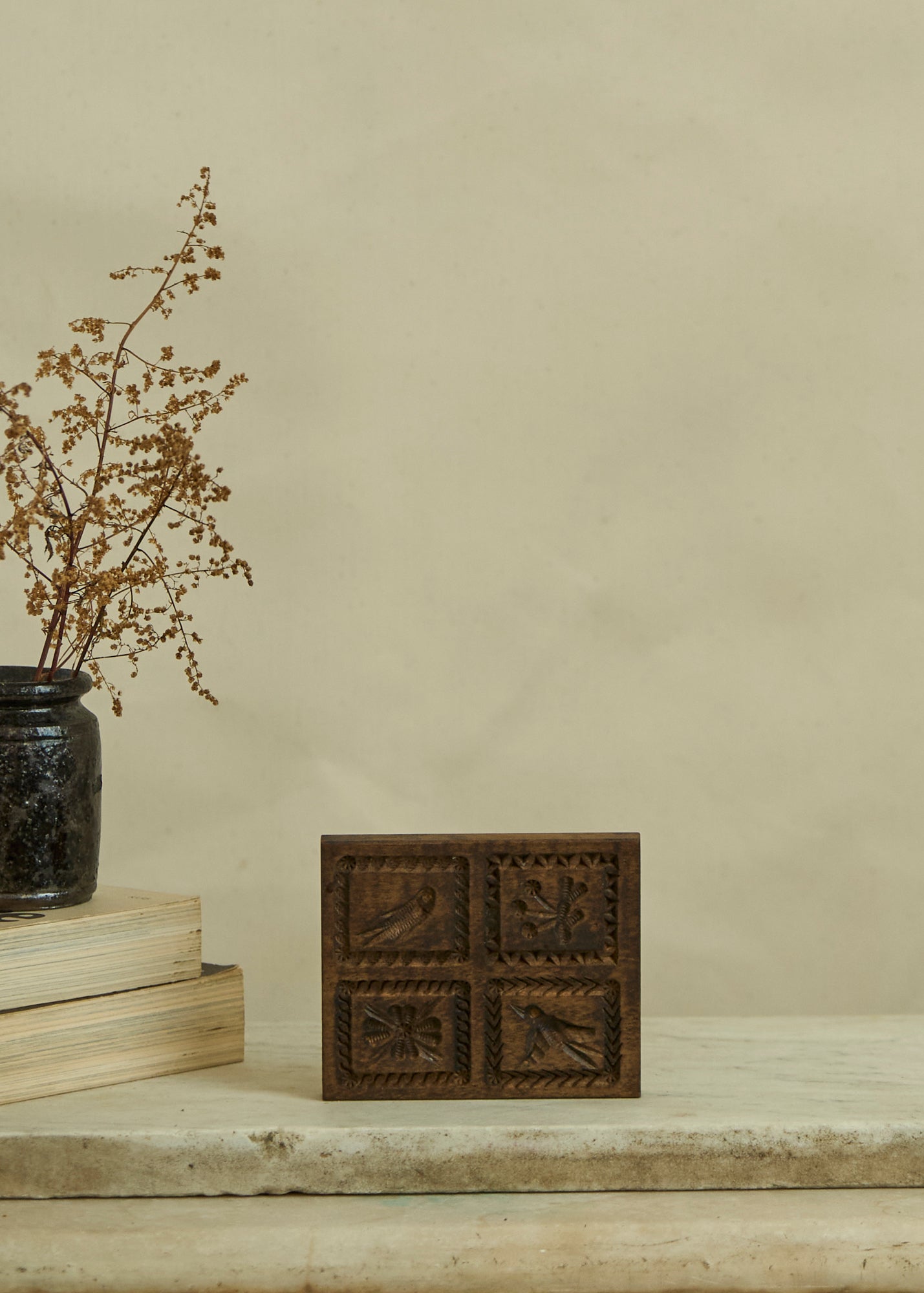 Vintage hand carved folk art wooden mold featuring birds and florals. Metal hardware mounted on back.