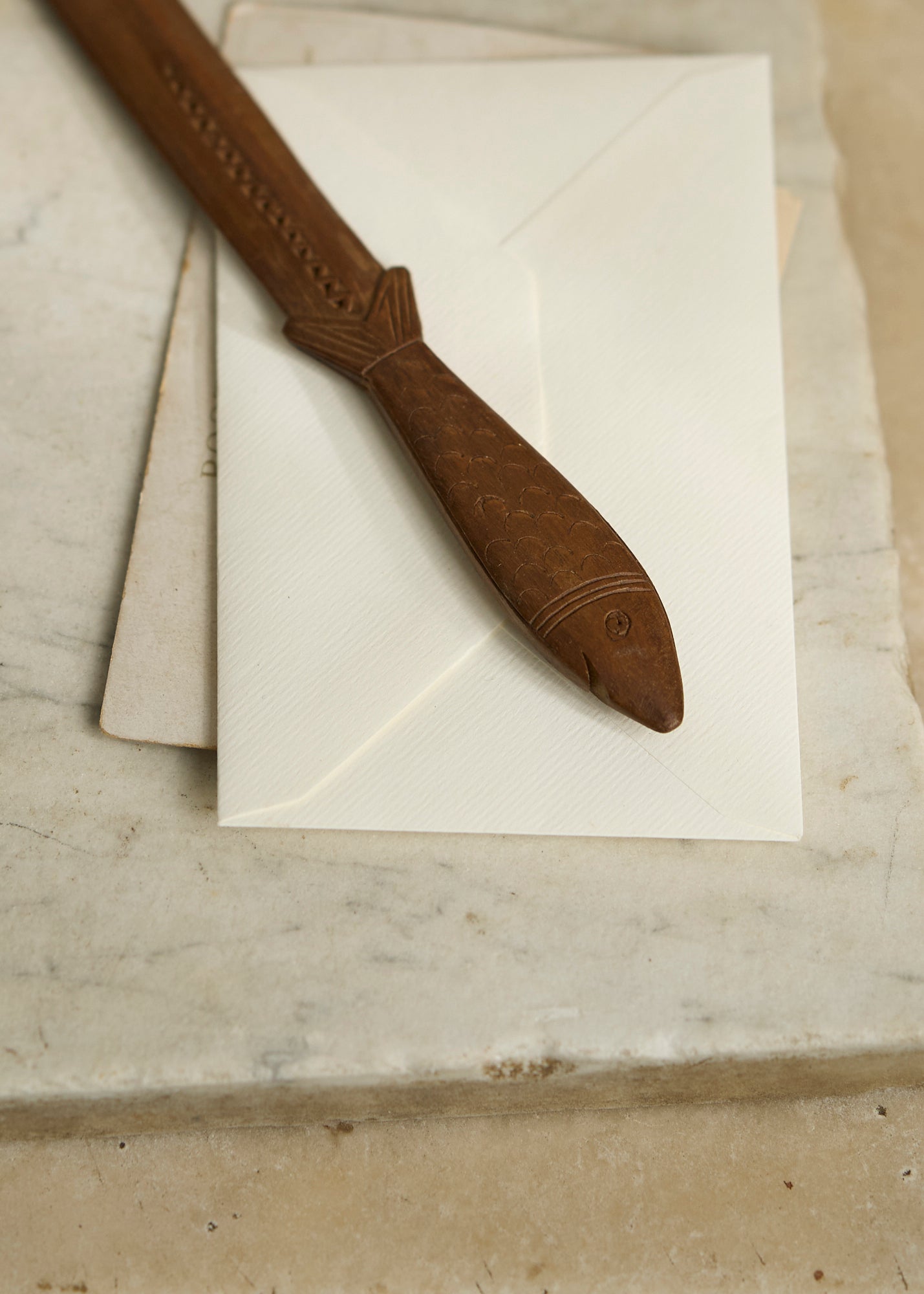 A vintage folk art hand carved letter opener with fish motif. Whimsical addition to your desk supplies.
