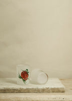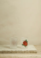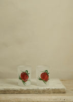 Vintage set of frosted drinking glasses with hand painted tomato motif.
