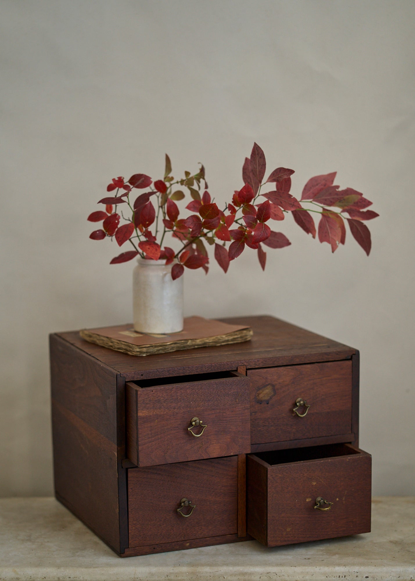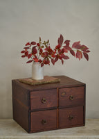 Gorgeous wooden tabletop apothecary cabinet with four drawers. Incredibly sturdy. A wonderful place to store your most important trinkets and documents or use in the kitchen to store spices and small jars.