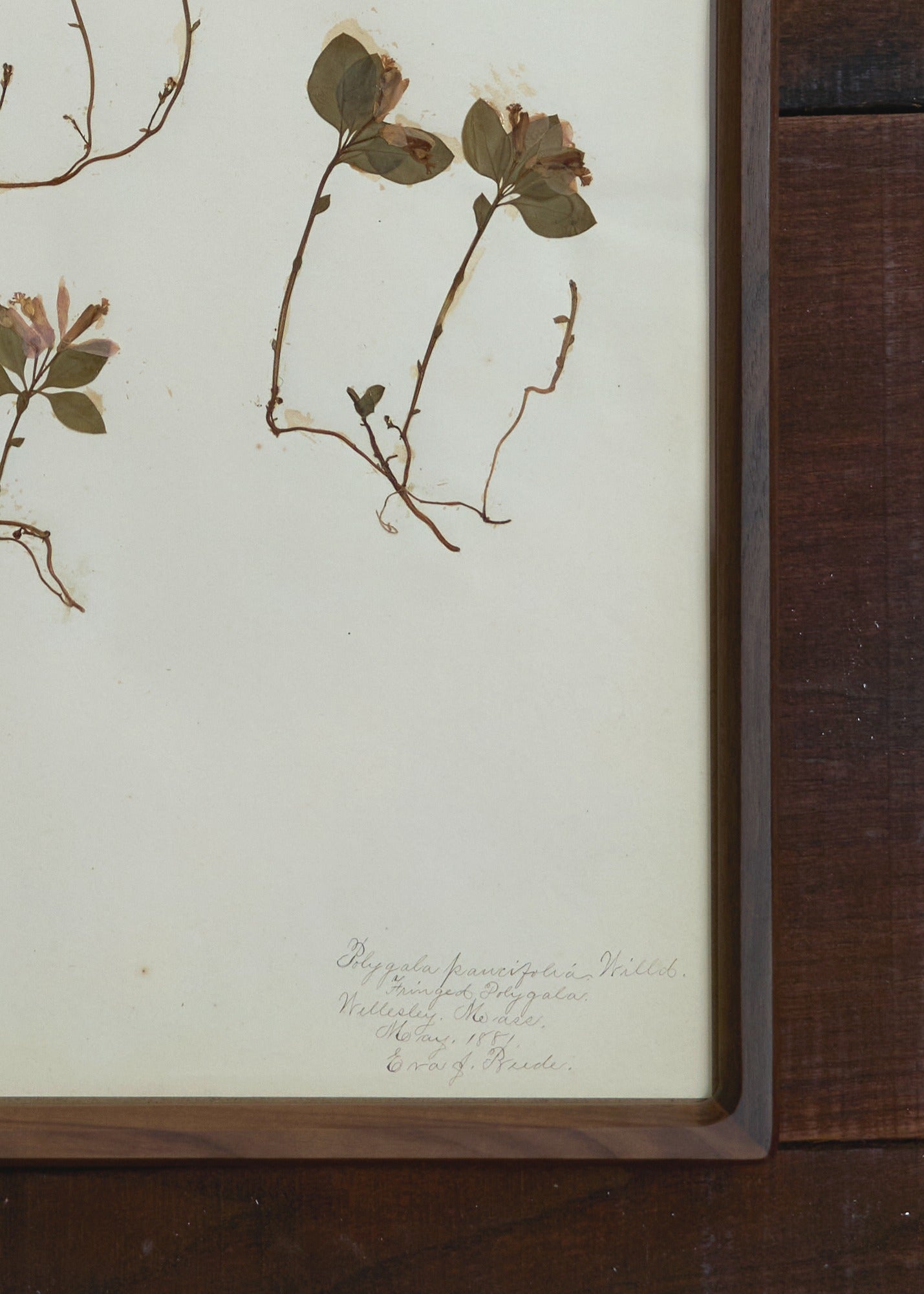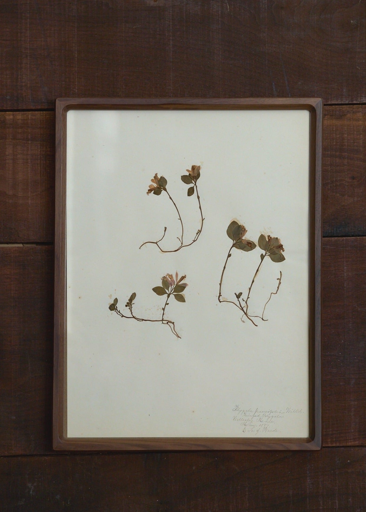 These botanical pressings were collected by Eva Beede Odell in the 1880's; each pressing is dated with the name of the plant species and the location where Eva collected the specimen. The pressings have all been carefully framed in gorgeous solid walnut frames that are ready for hanging. Each framed pressing includes a typed description about the origin of the pressings and a bit about Eva herself.