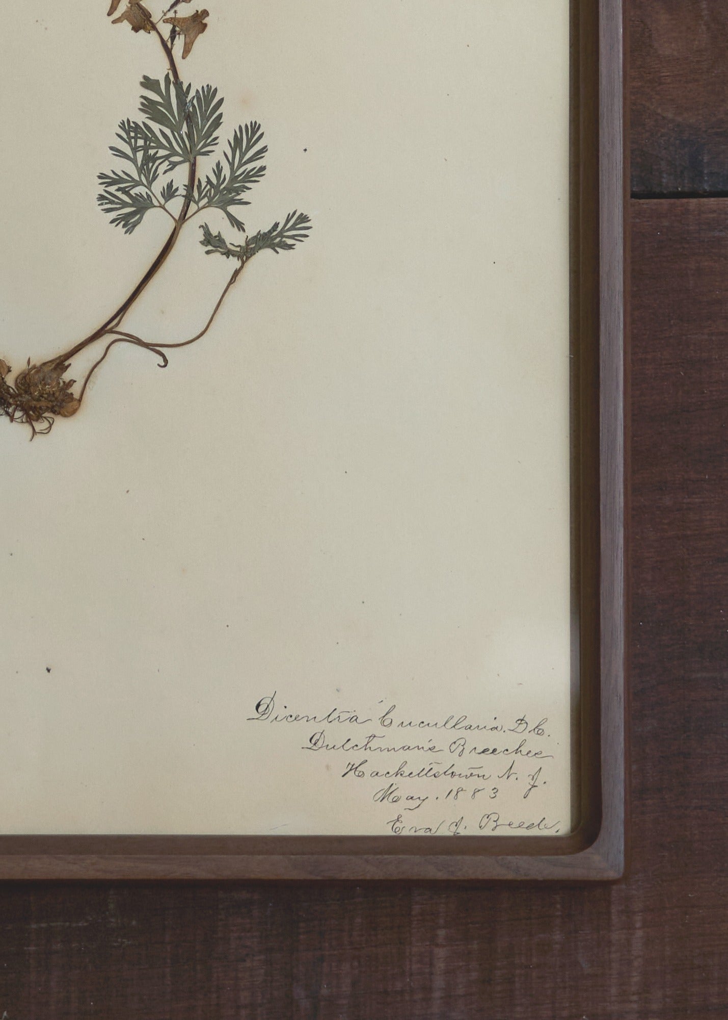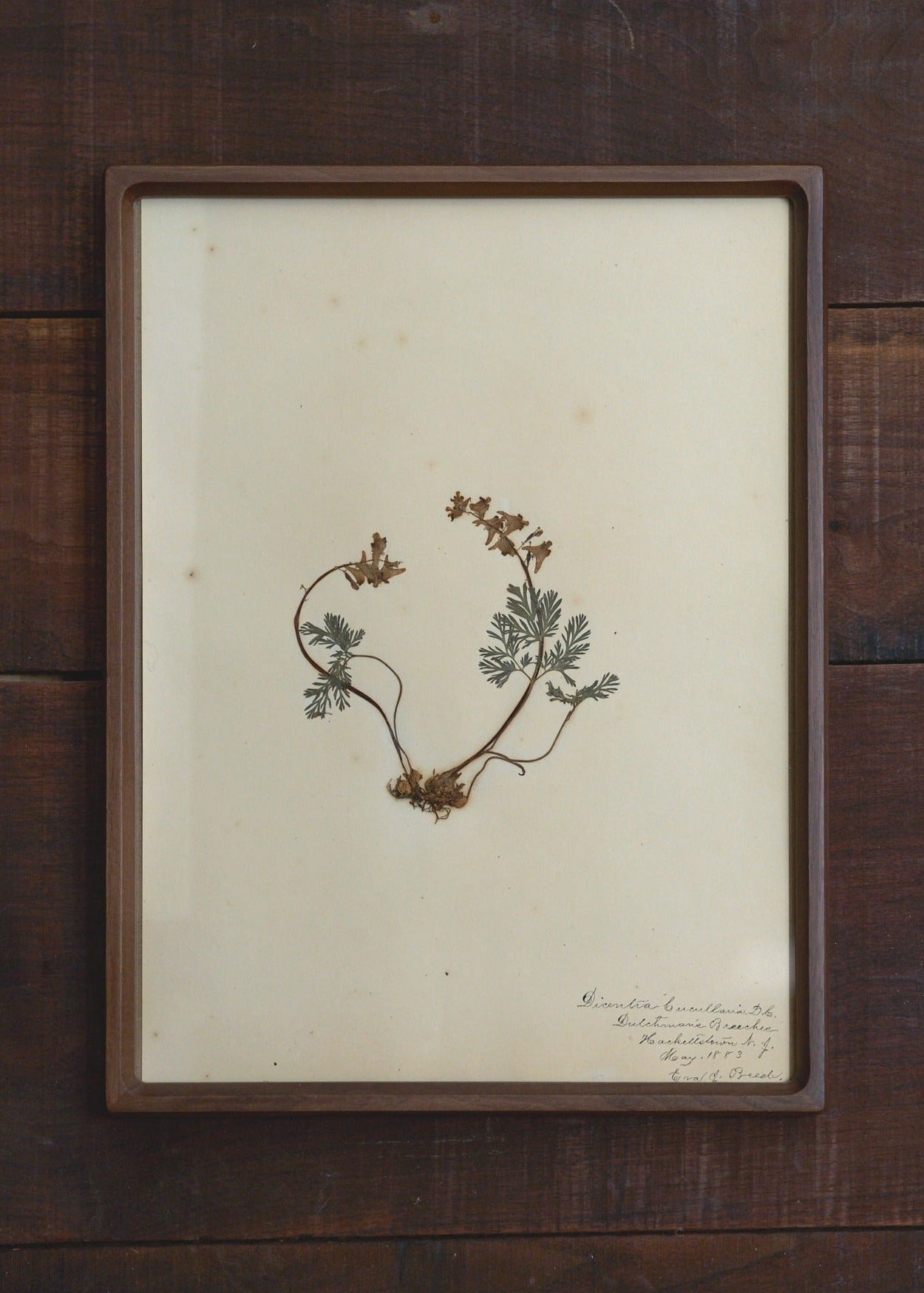 These botanical pressings were collected by Eva Beede Odell in the 1880's; each pressing is dated with the name of the plant species and the location where Eva collected the specimen. The pressings have all been carefully framed in gorgeous solid walnut frames that are ready for hanging. Each framed pressing includes a typed description about the origin of the pressings and a bit about Eva herself.
