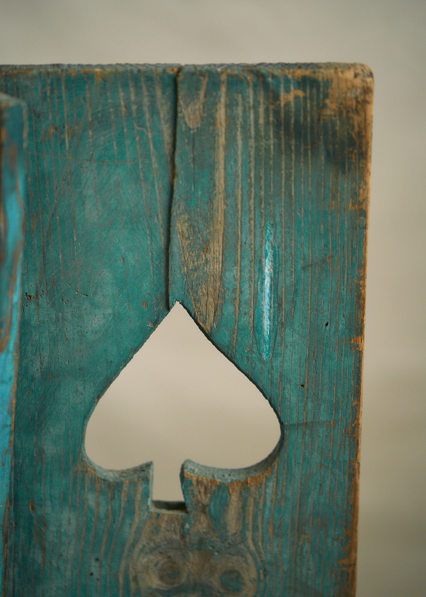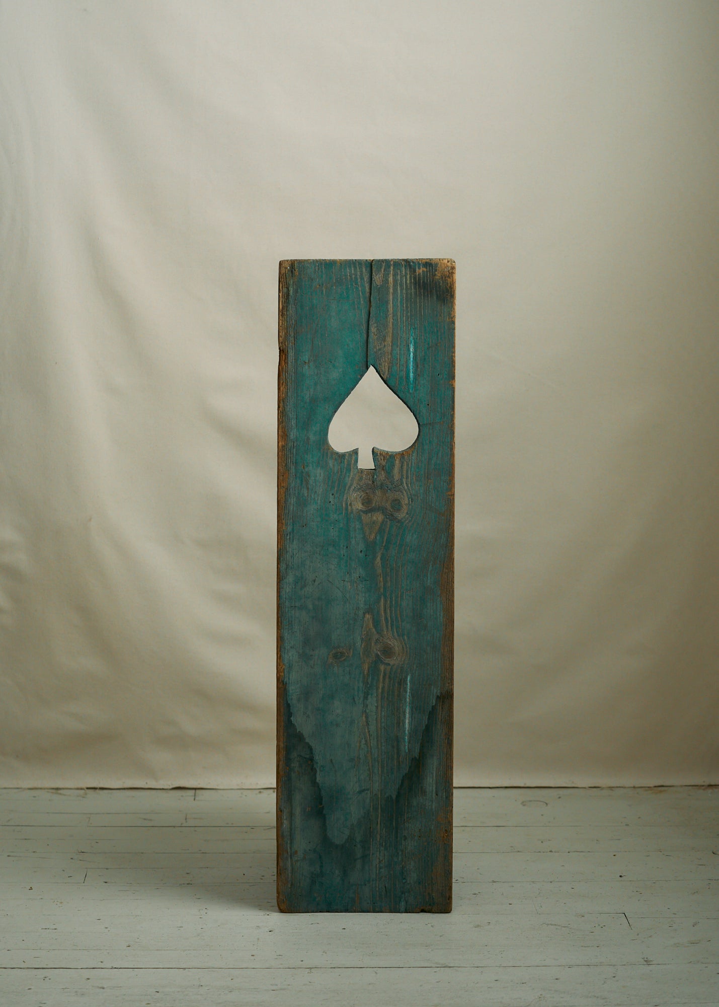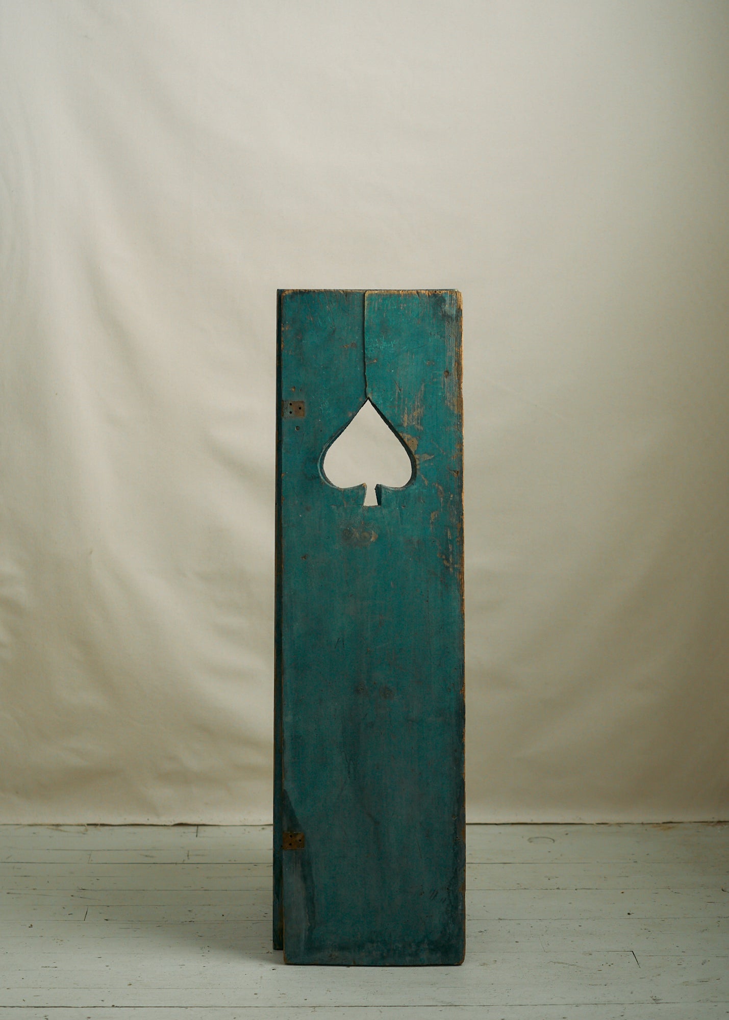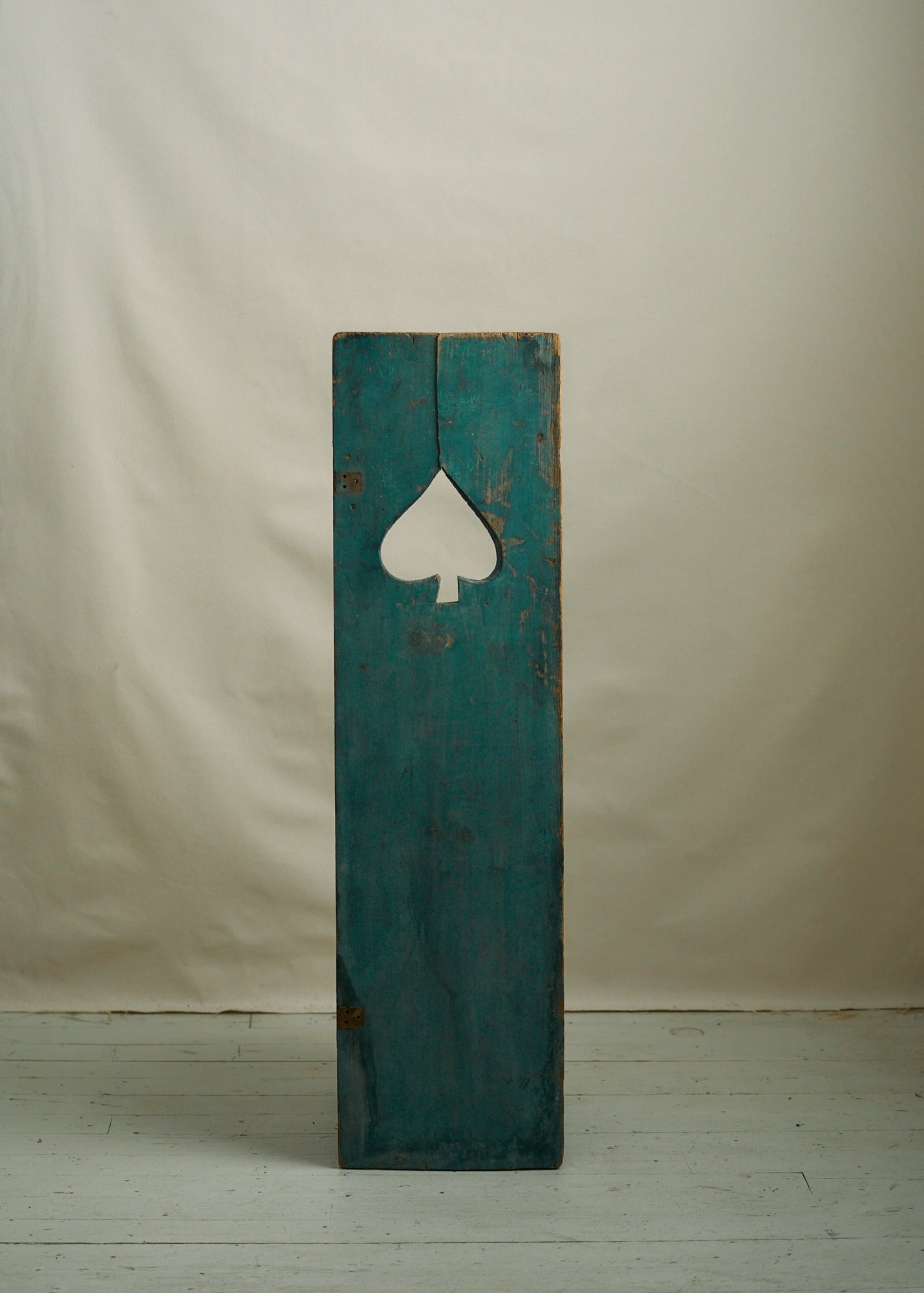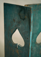 A unique pair of early 20th century wooden shutters with spade cutout. Faded blue green paint. Use in a cottage remodel or simply hang on the wall as art. Sold as a set.