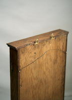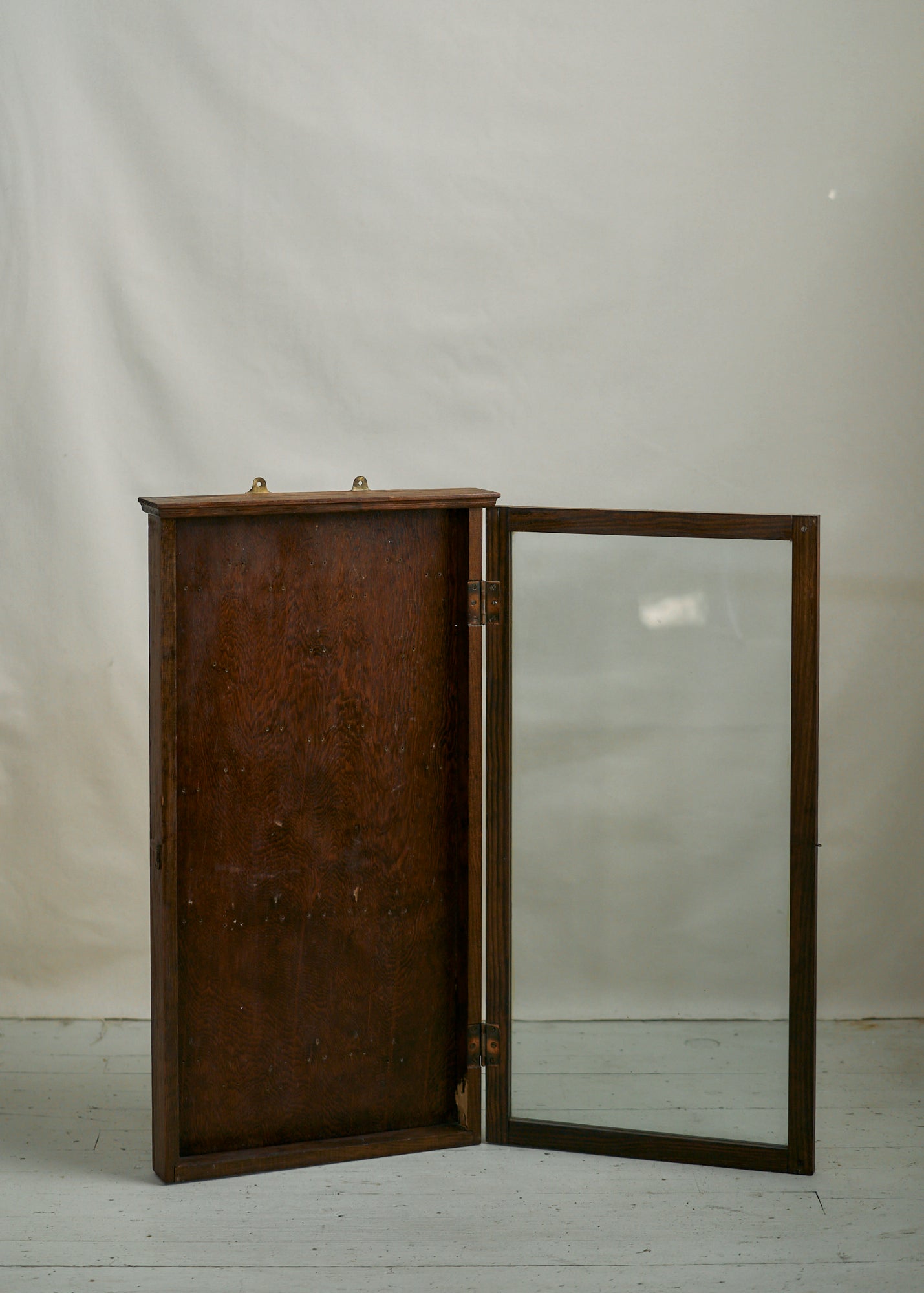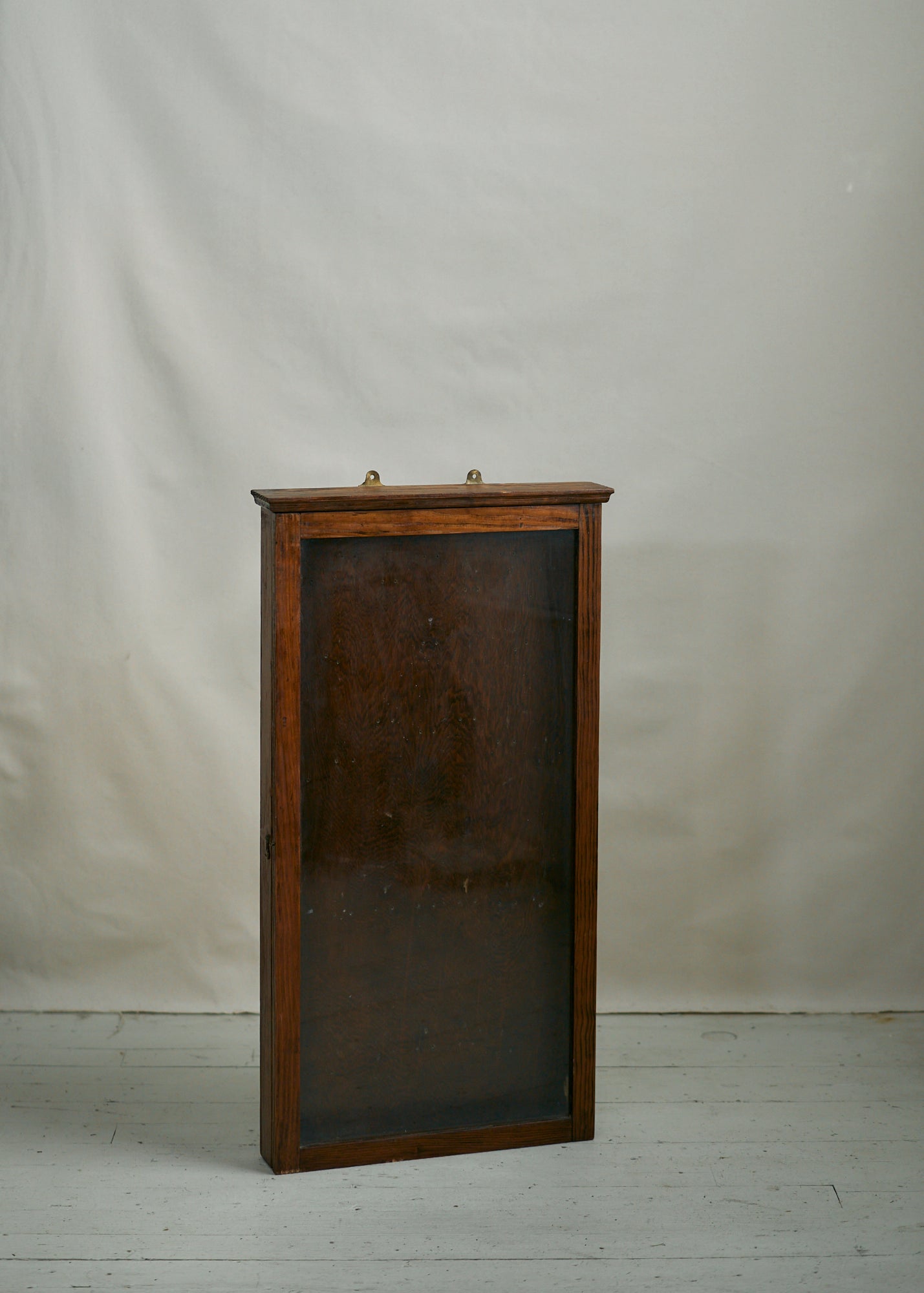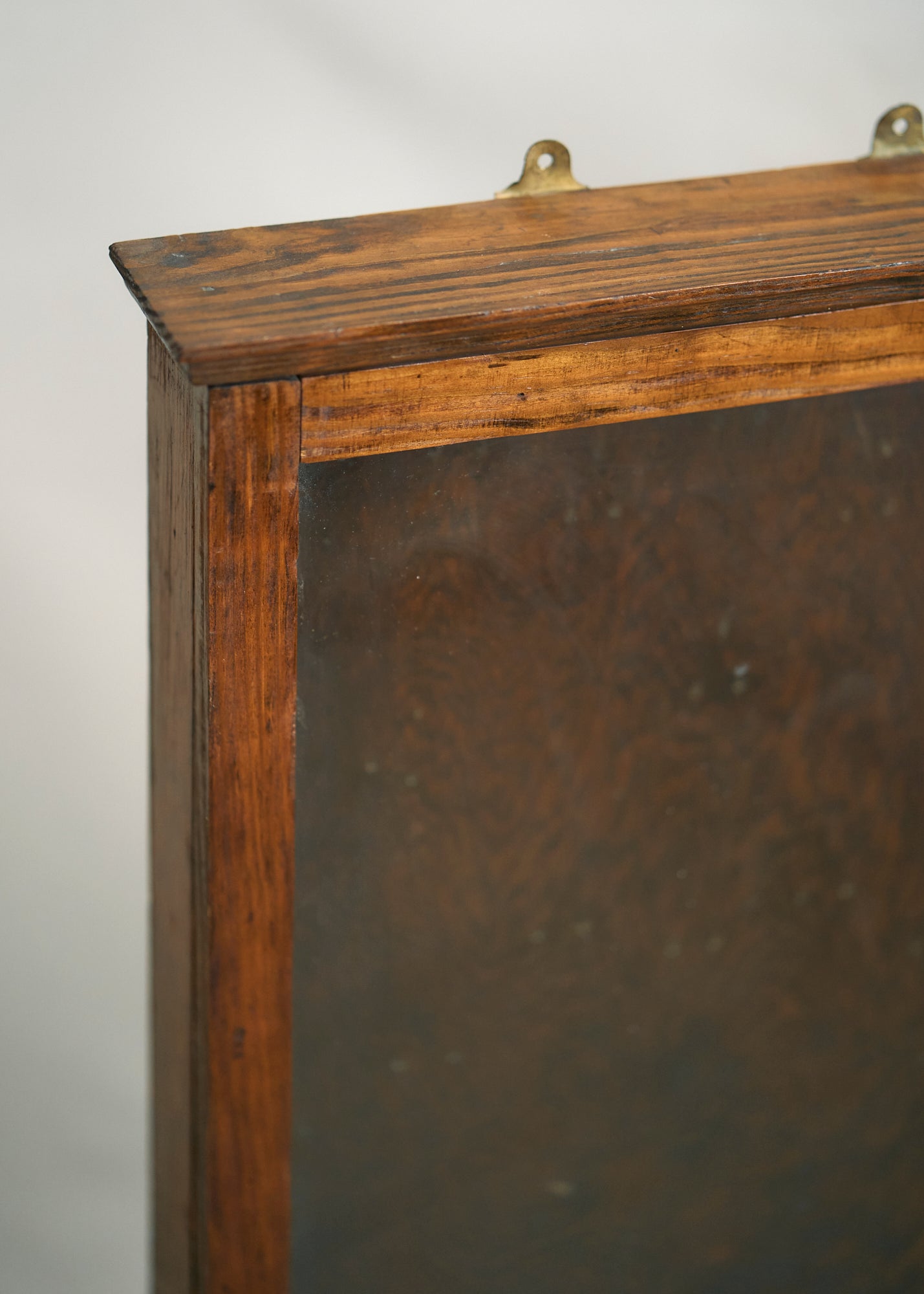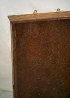 Gorgeous vintage wooden display case with glass front. Can be hung on a wall (has hardware to enable that) or can be used on a tabletop. Could also use as a shadowbox to display sentimental items. Please note there are small nail holes in the surface of the wood from its past use as a hanging display case. Can easily tuck in a piece of velvet or other fabric to cover this surface or simply embrace the storied patina.
