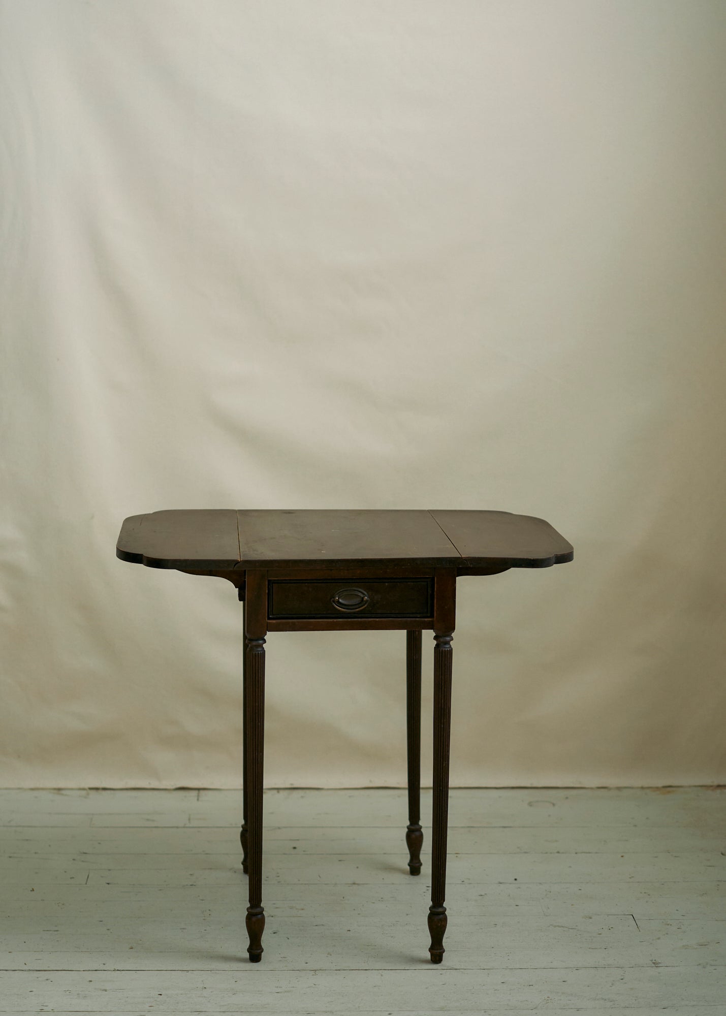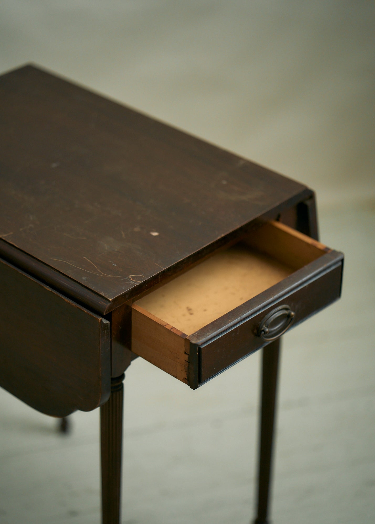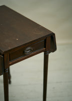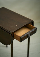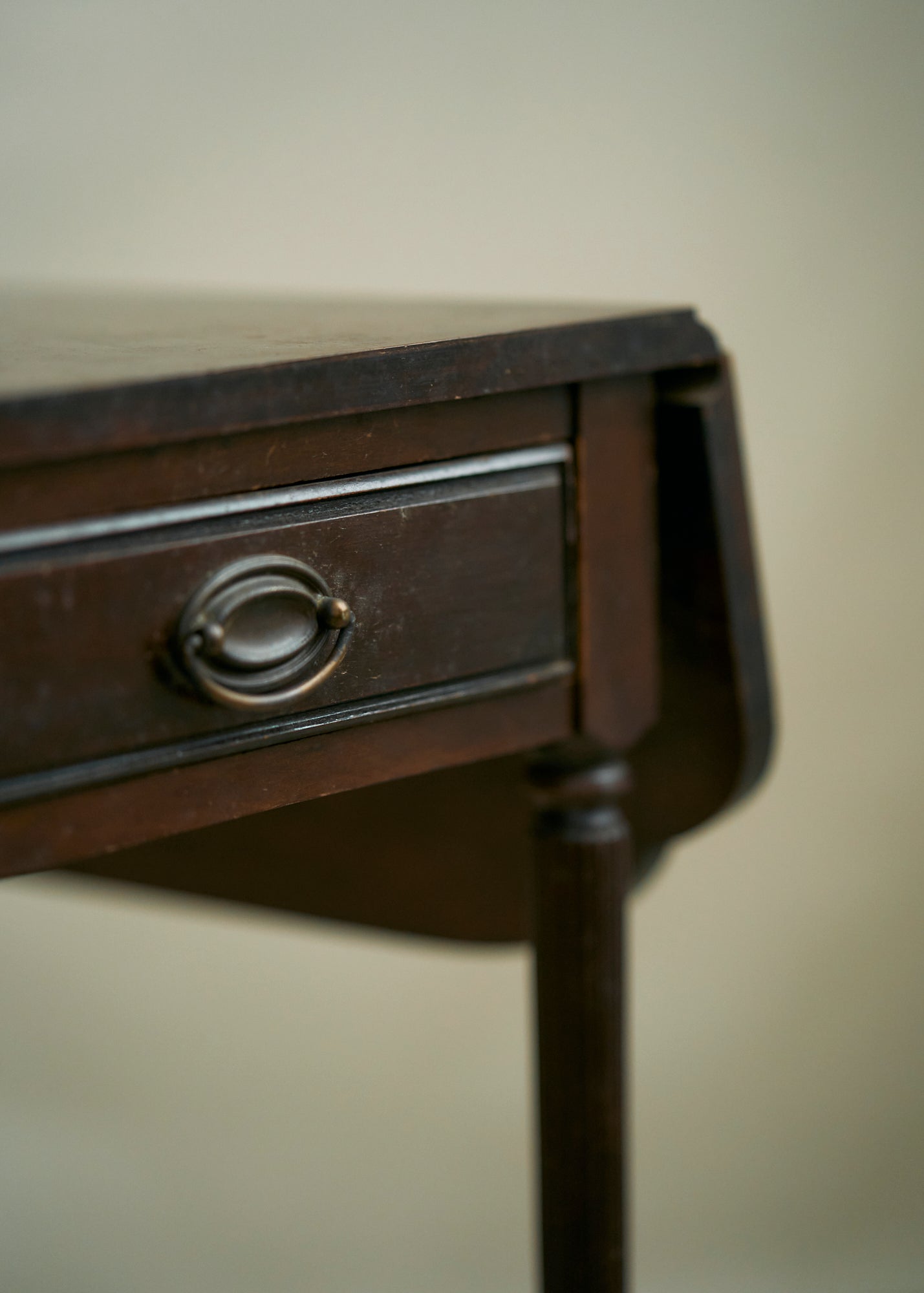 Small dark wood, one drawer drop leaf table. A perfect accent or side table.