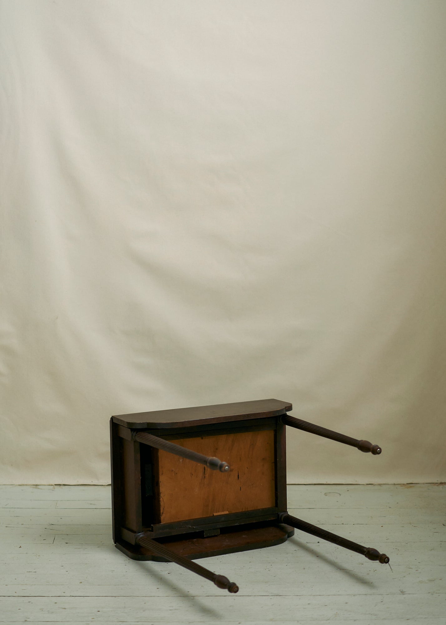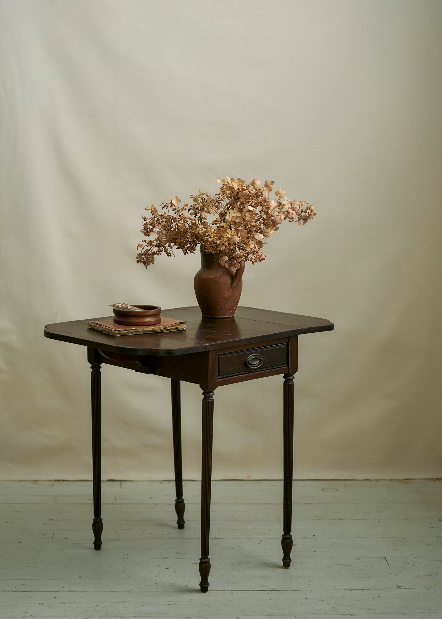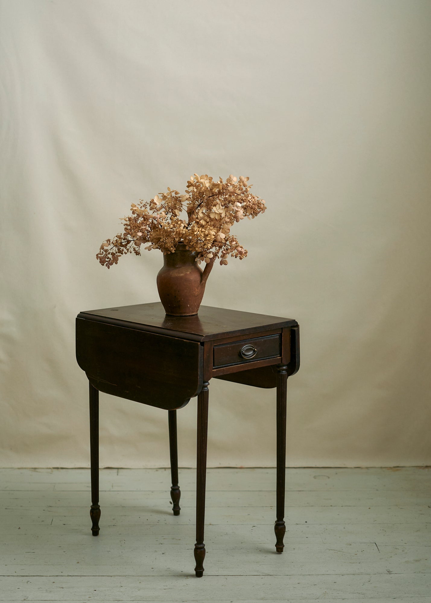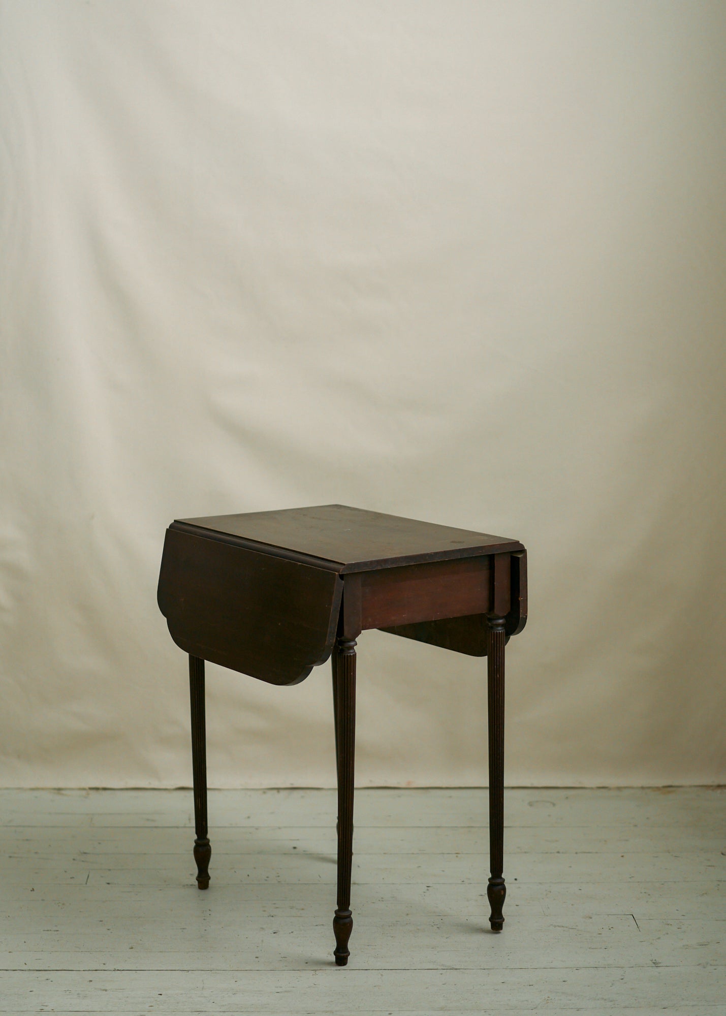 Small dark wood, one drawer drop leaf table. A perfect accent or side table.