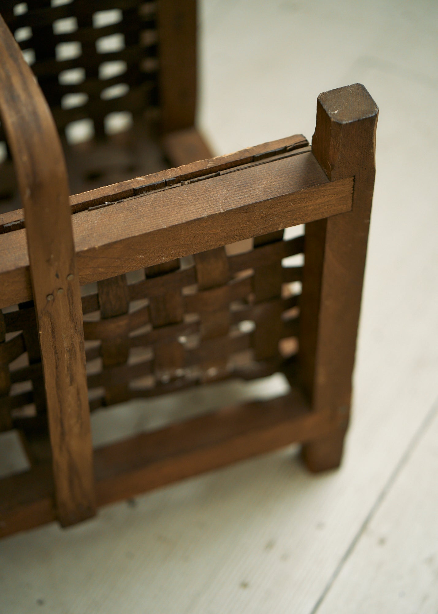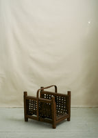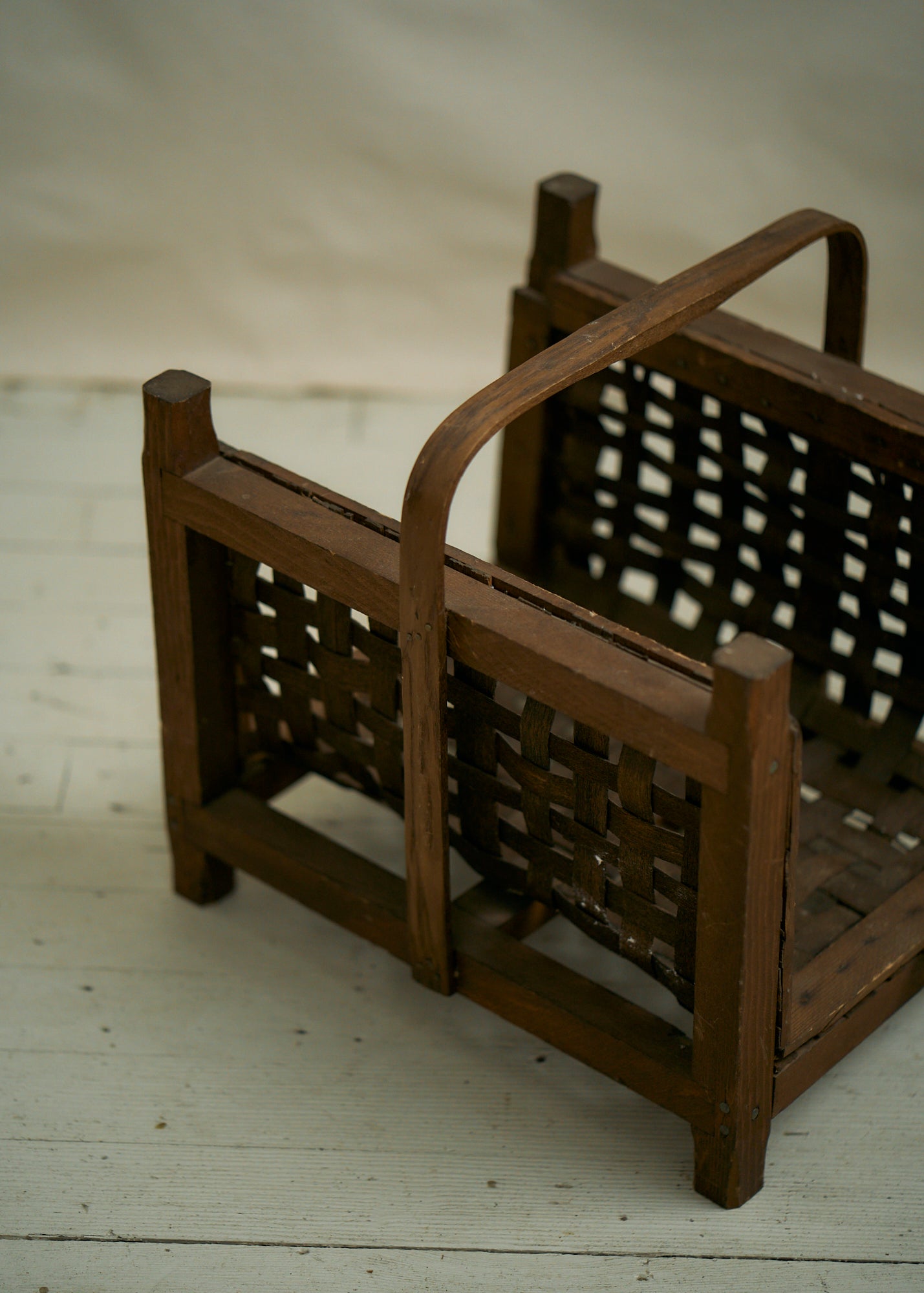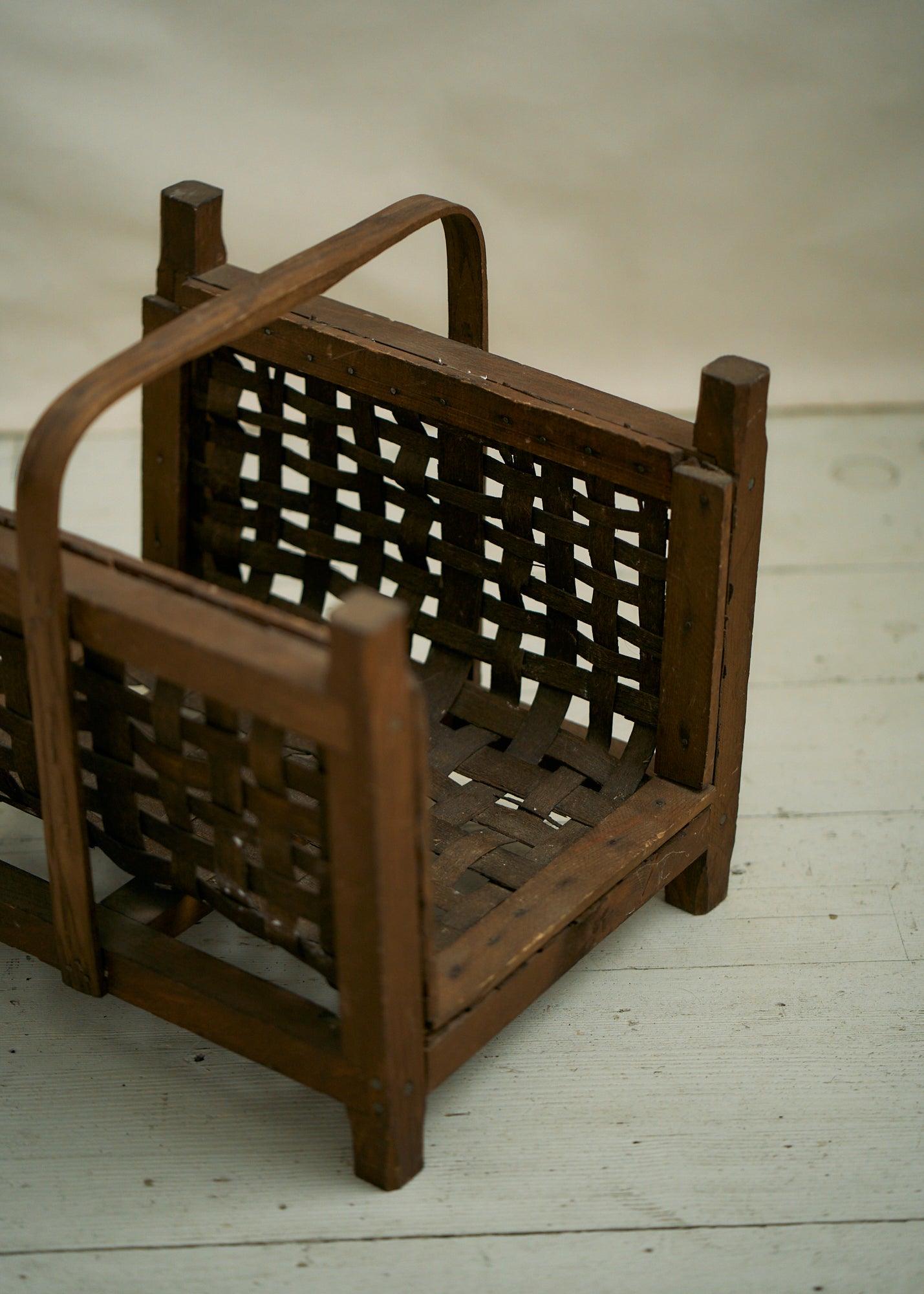 Gorgeous handmade split firewood holder with wooden framework and handle. Unique in its shape and design.