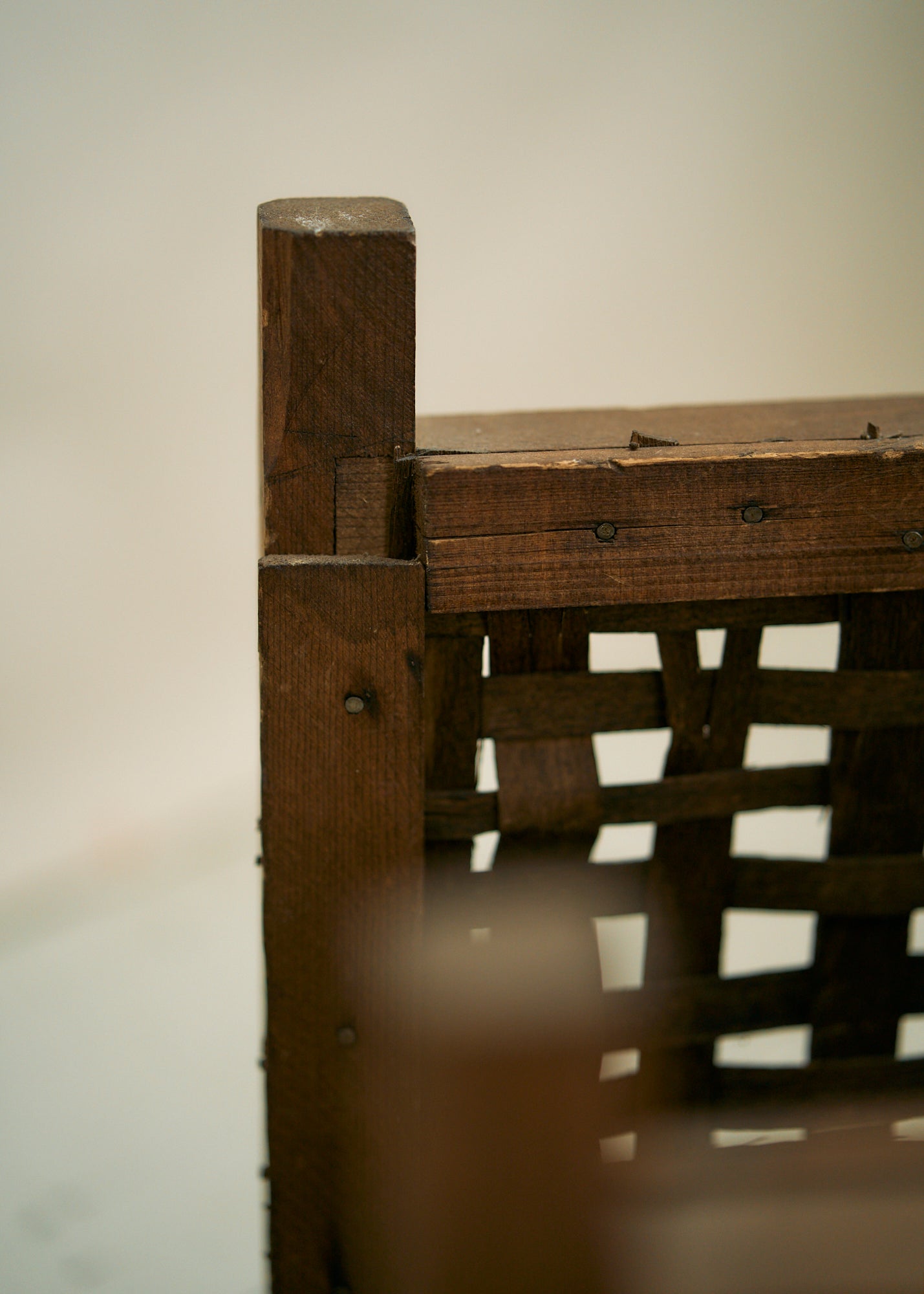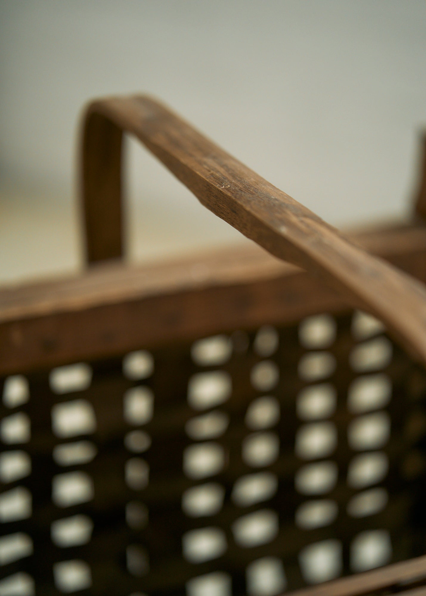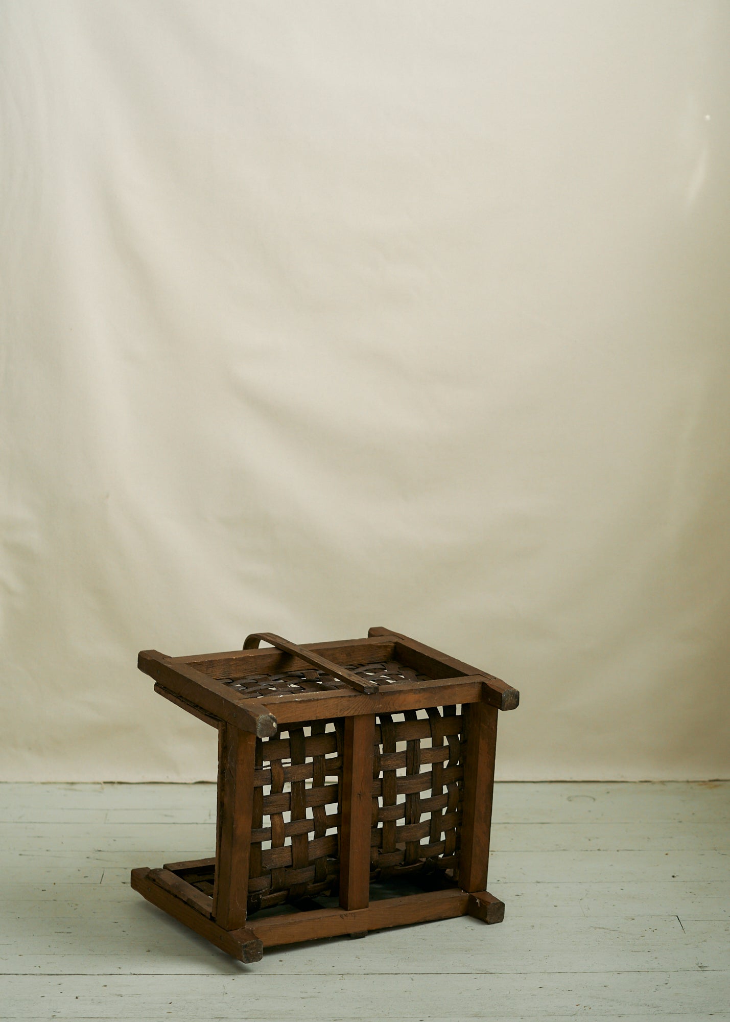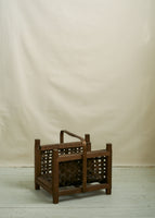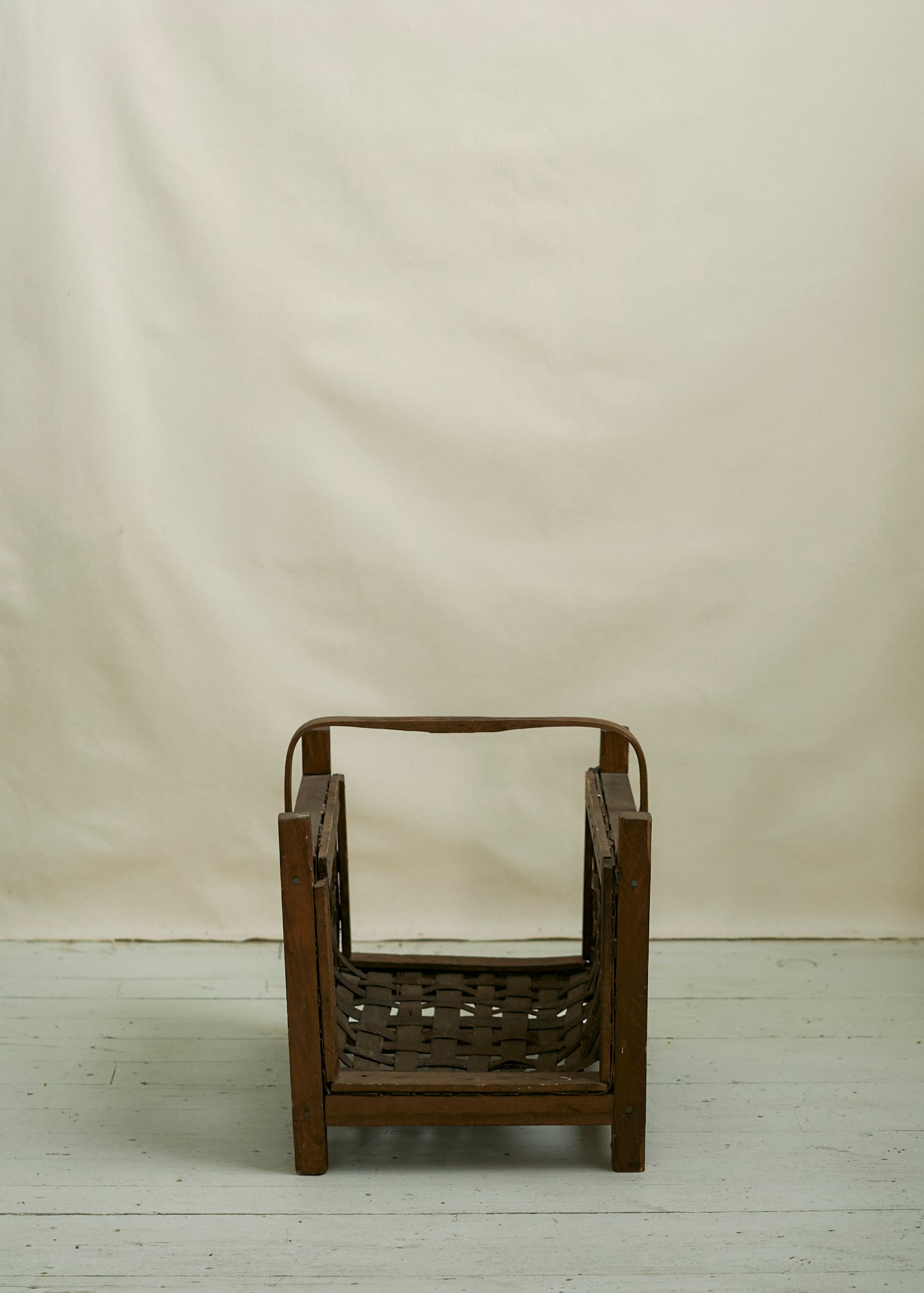 Gorgeous handmade split firewood holder with wooden framework and handle. Unique in its shape and design.