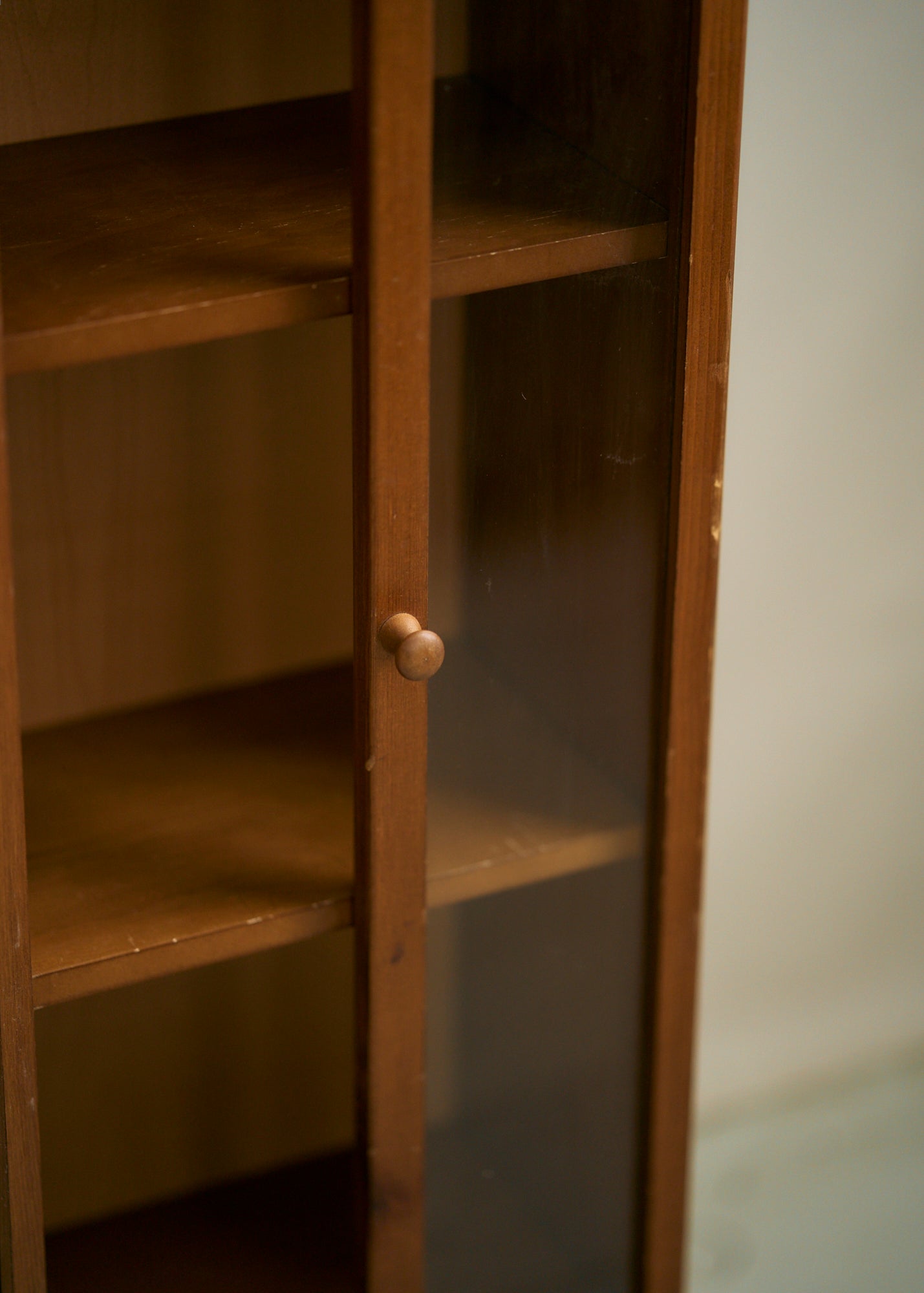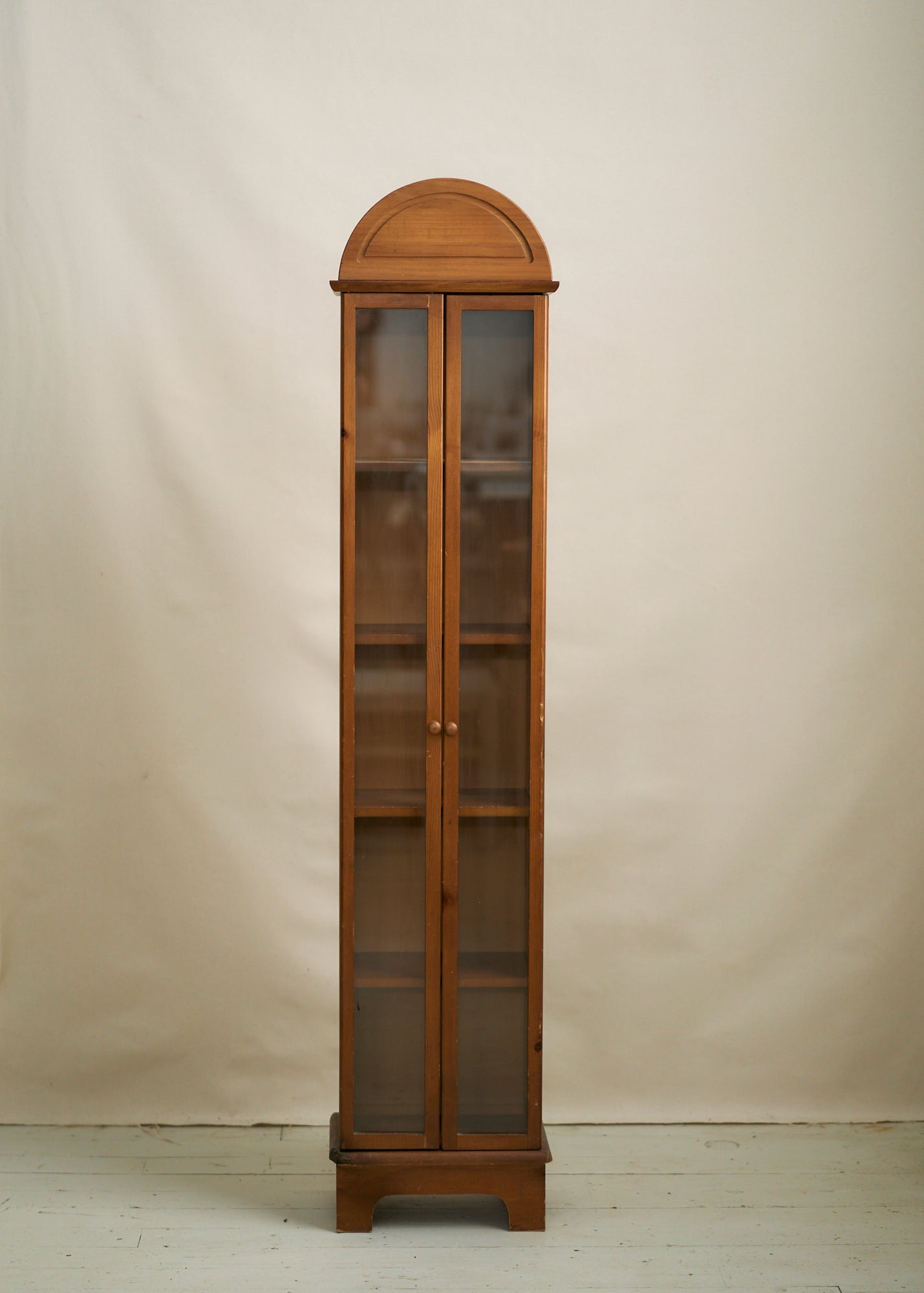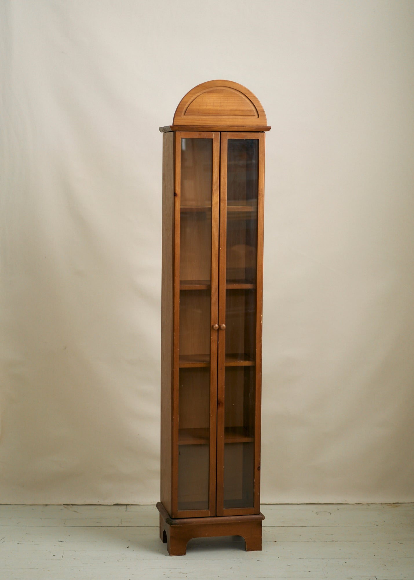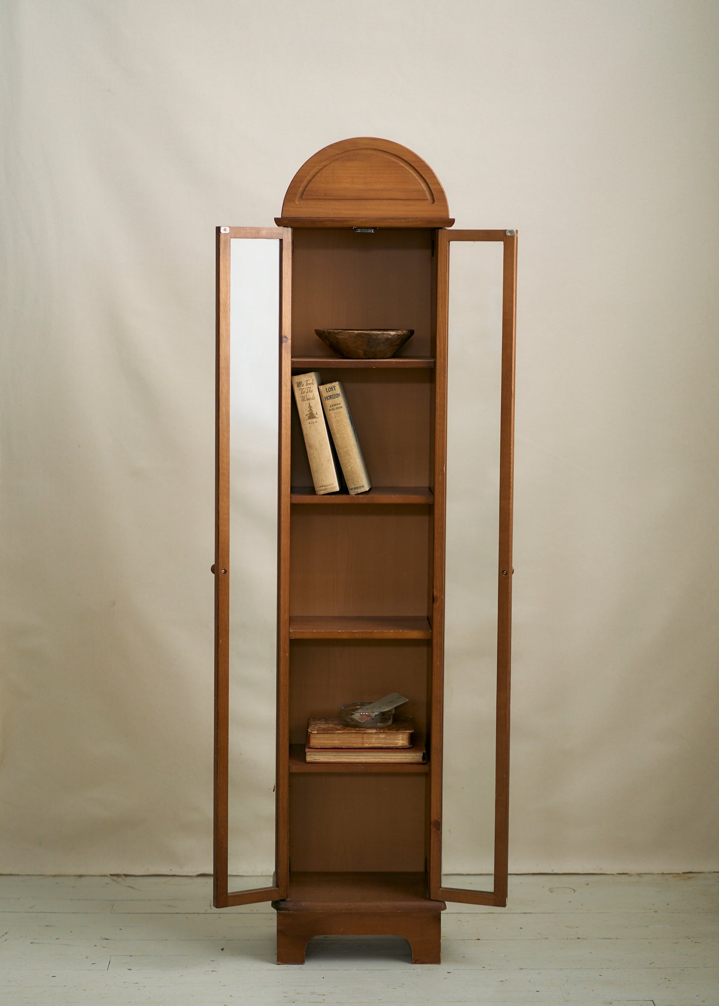 Tall, thin wooden cabinet with two glass front doors and four shelves. A perfect storage piece for the bathroom, kitchen, etc.