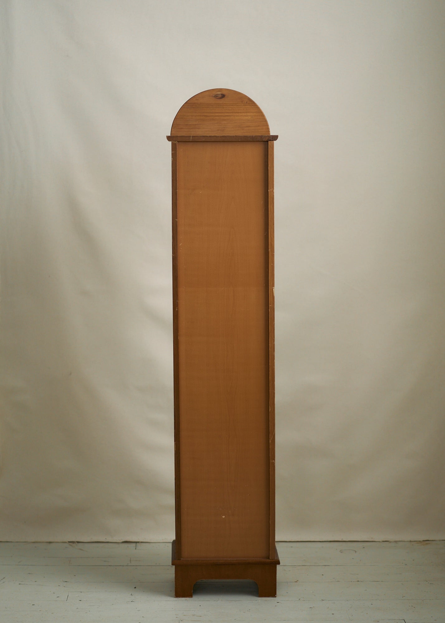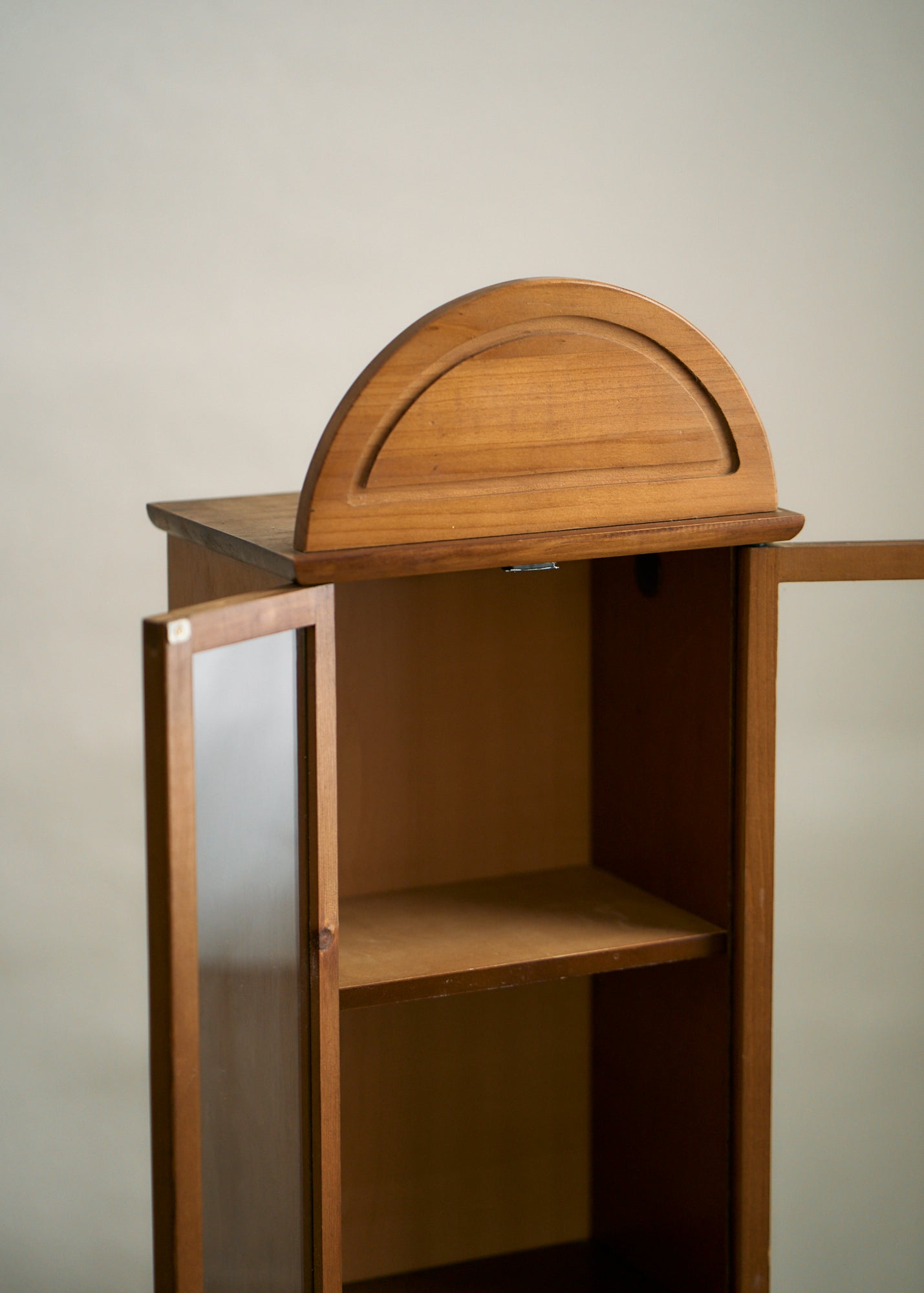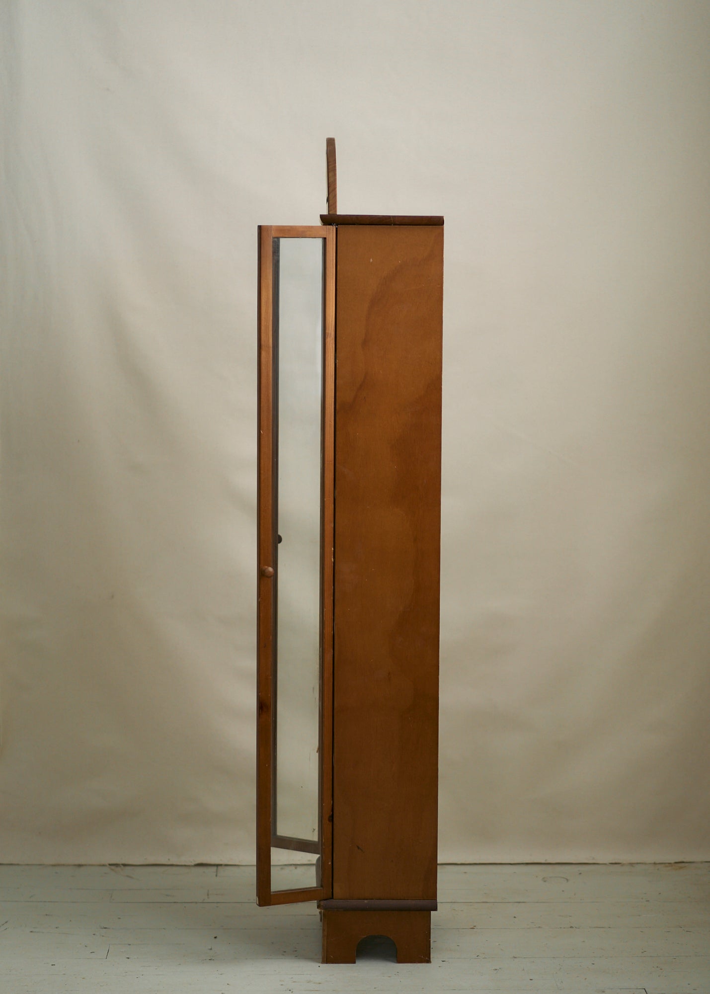 Tall, thin wooden cabinet with two glass front doors and four shelves. A perfect storage piece for the bathroom, kitchen, etc.