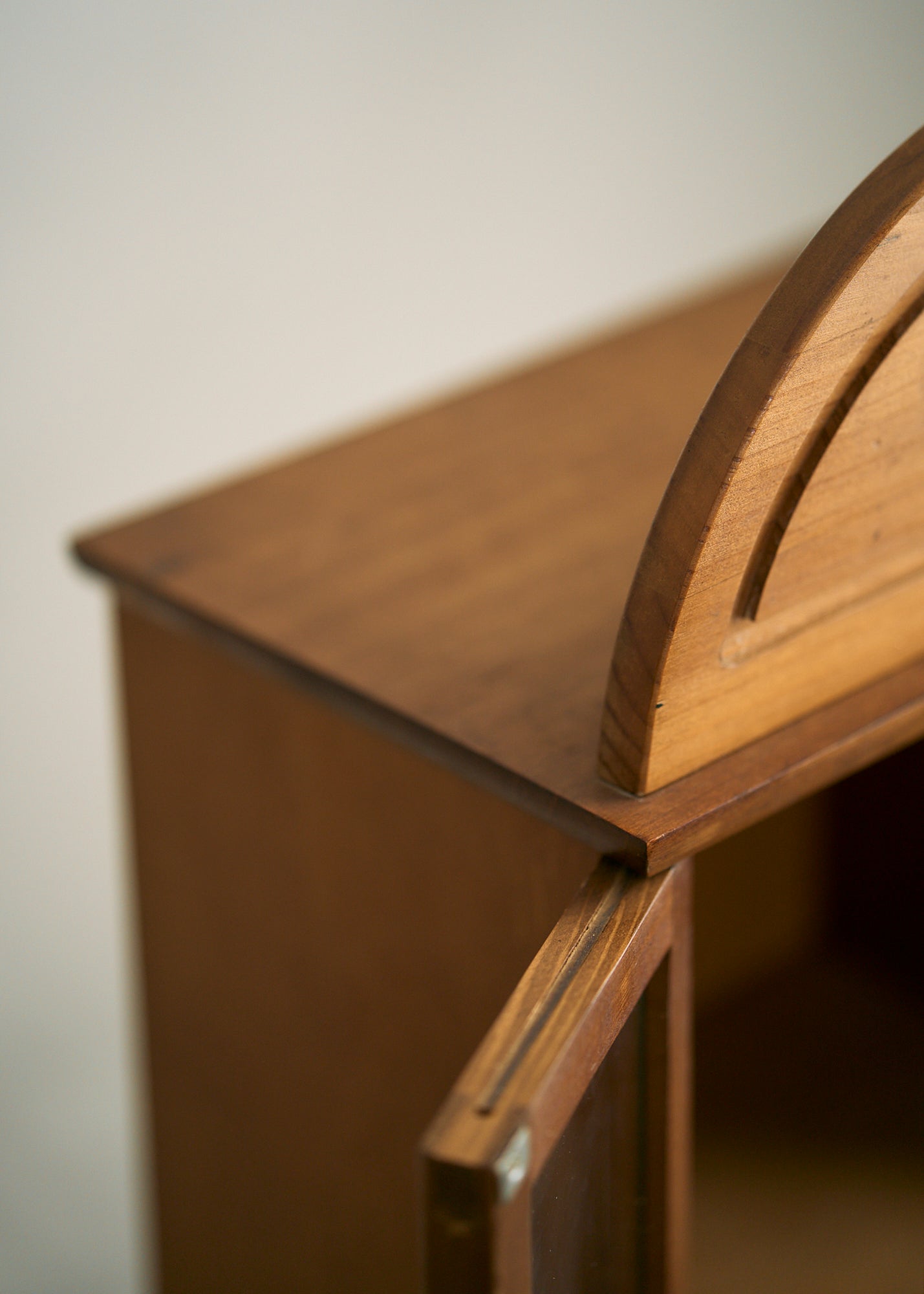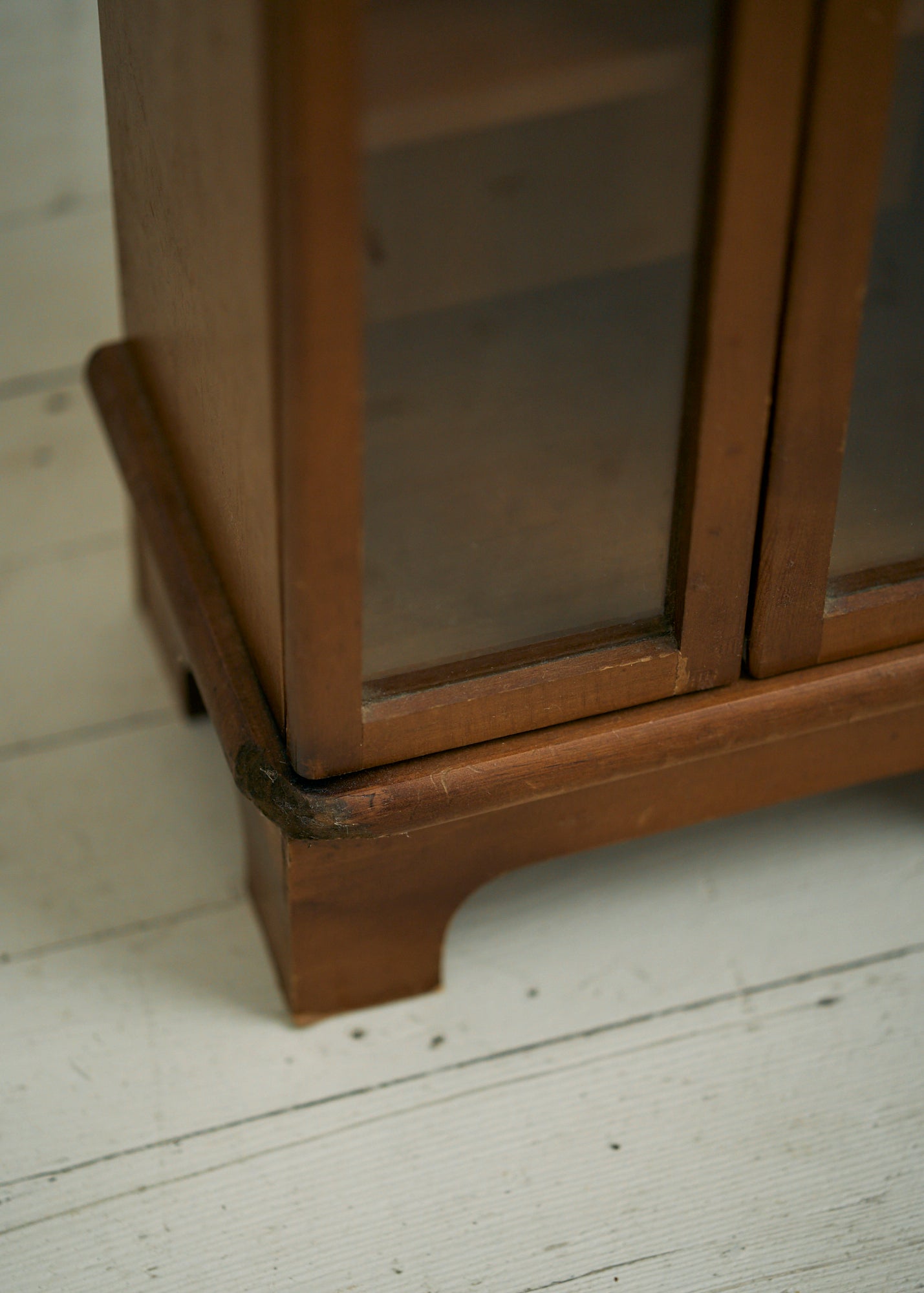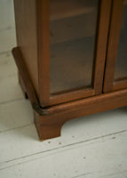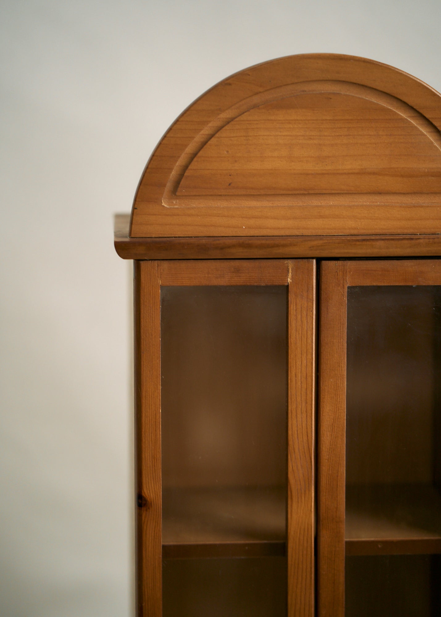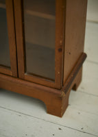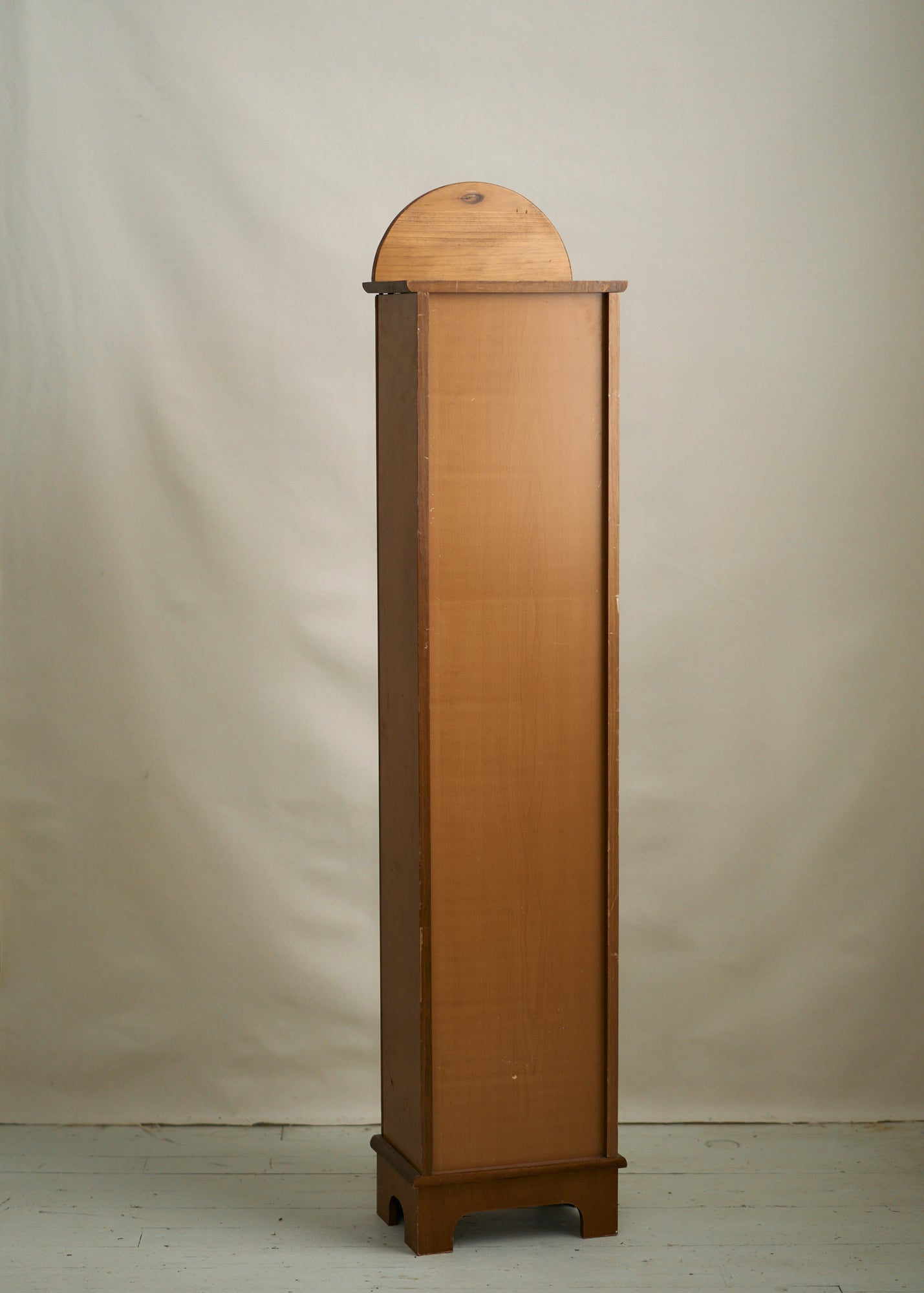 Tall, thin wooden cabinet with two glass front doors and four shelves. A perfect storage piece for the bathroom, kitchen, etc.