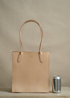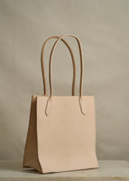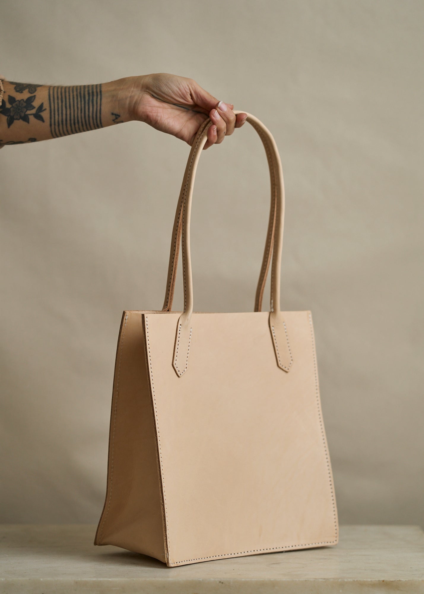 Natural vegetable tanned leather is untreated and will age beautifully as you start to use it. Veg tan leather patinas with time and exposure to the sun - it starts as a pale pink but will eventually turn into a gorgeous light honey brown color. The third photo shows how our natural veg tan bags will age and patina after approximately 4 weeks of use.