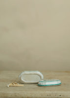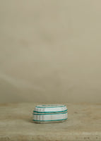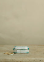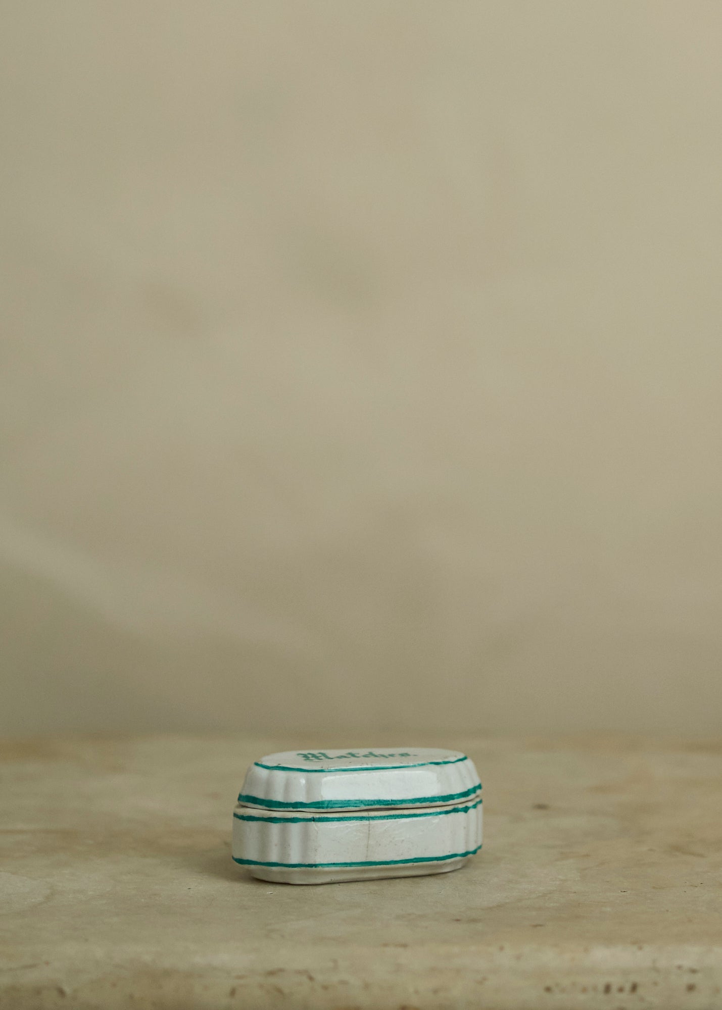 Small, handmade ceramic match safe with green painted lettering and detailing. Place on a surface in any room next to your candles or on a mantle over your fireplace for easy match access.