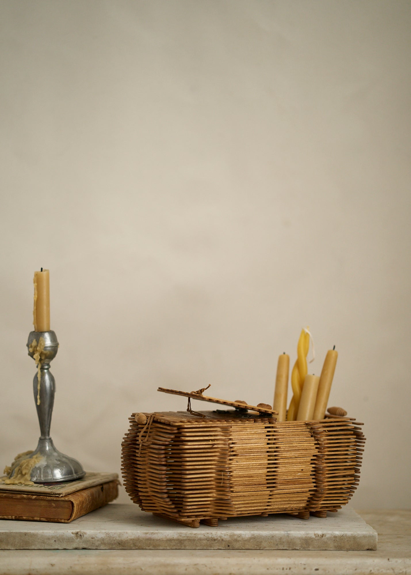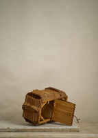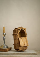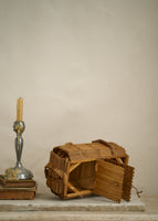 Antique handmade tramp art keepsake basket made out of popsicle sticks with toggle closures.