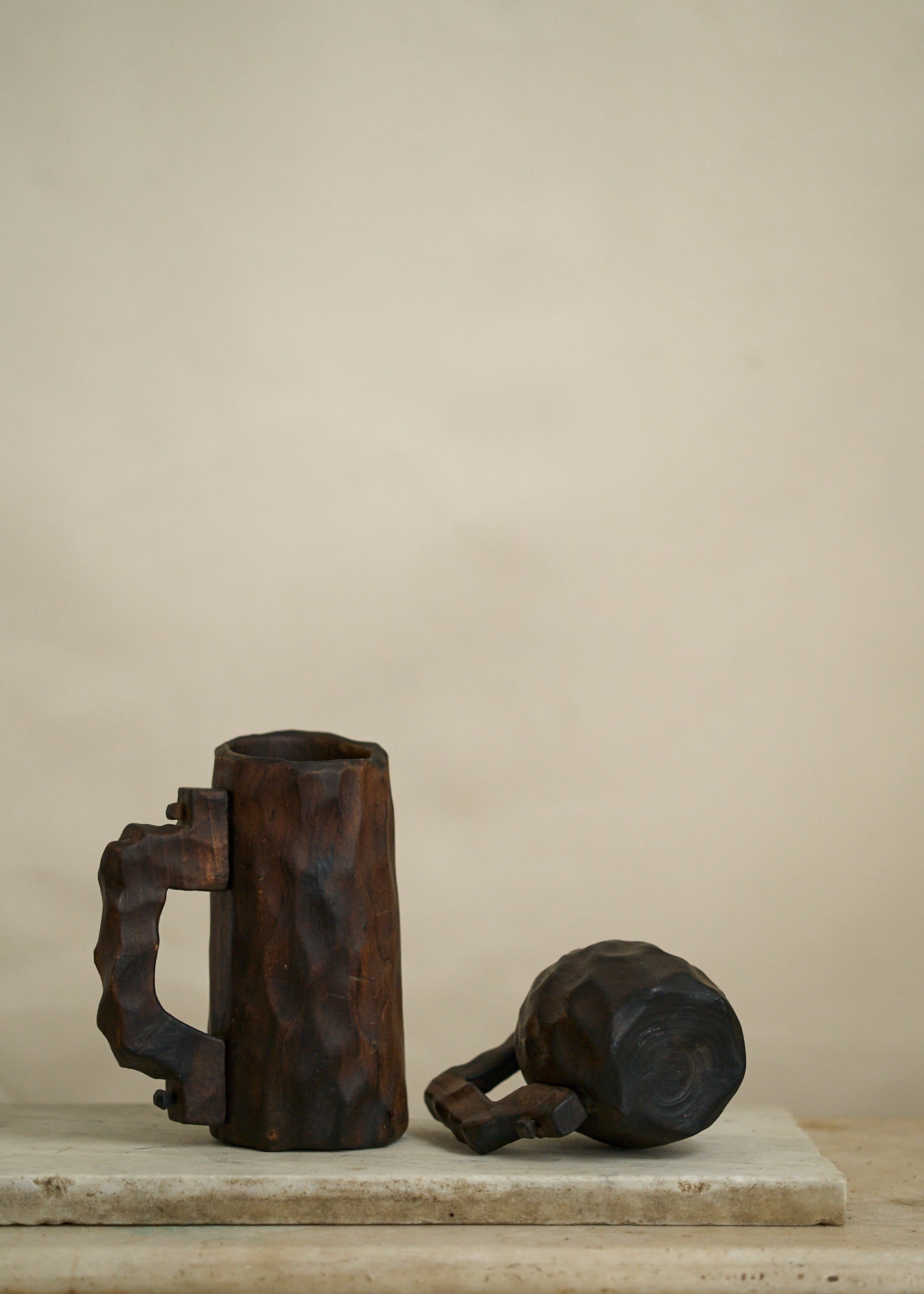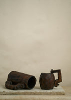 Vintage folk art hand carved wooden mugs. Wood pegs holding the carved handles on. Whimsical, charming, unique.