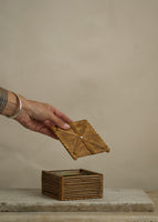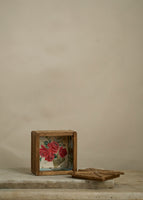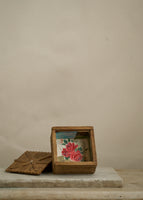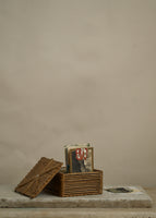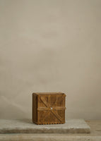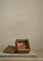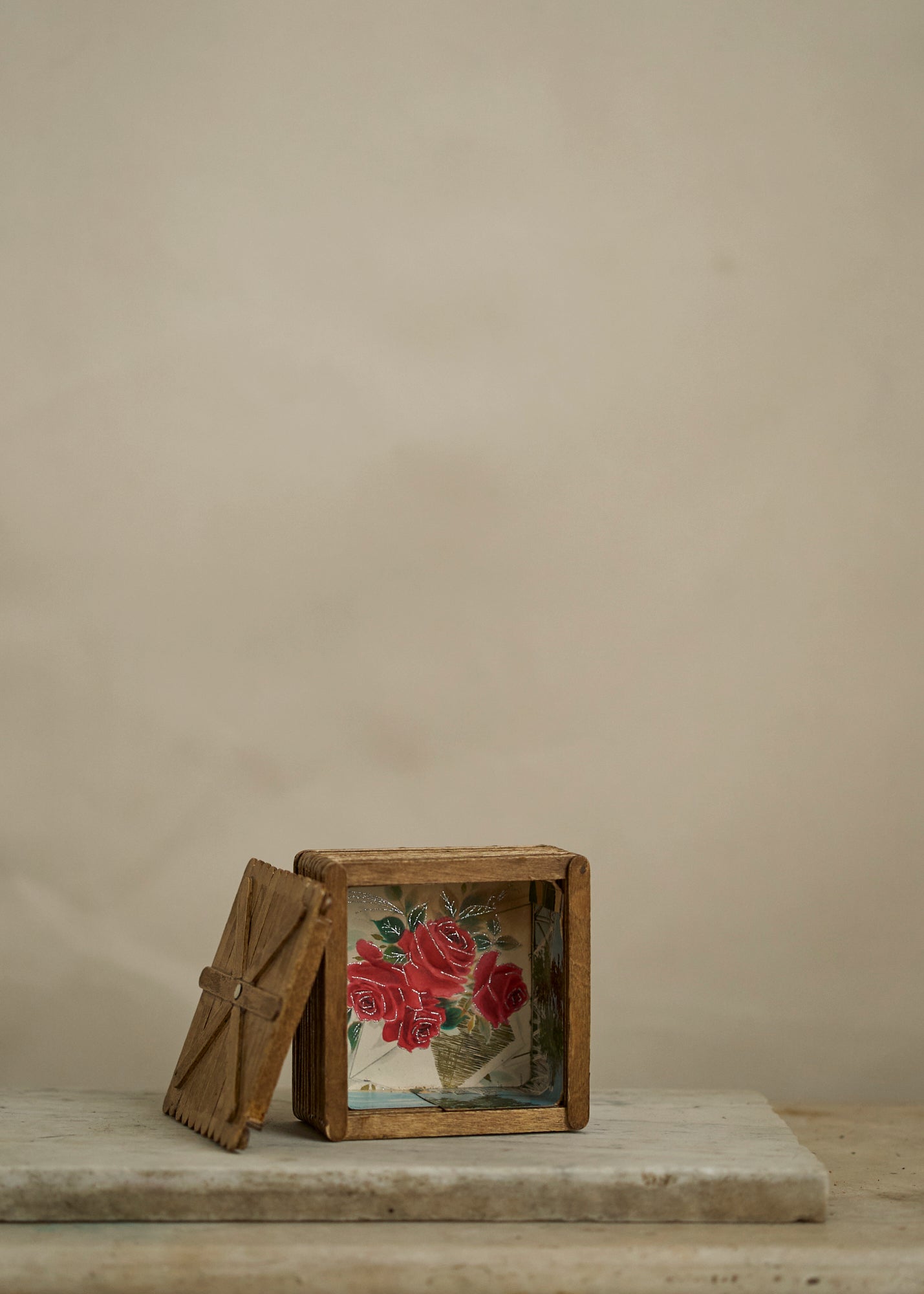 Antique folk art keepsake box made out of popsicle sticks. The interior of the box is lined with antique paper.