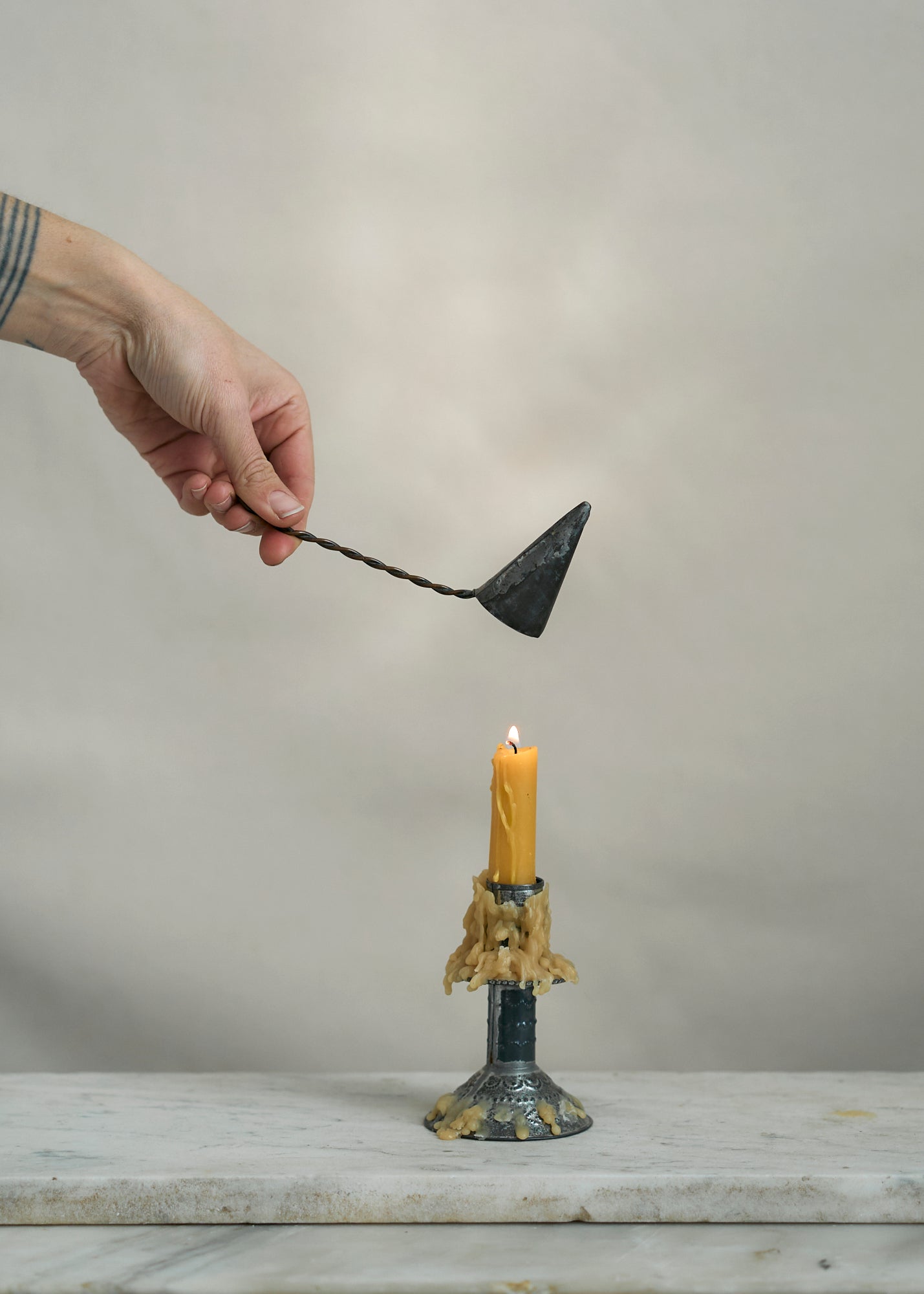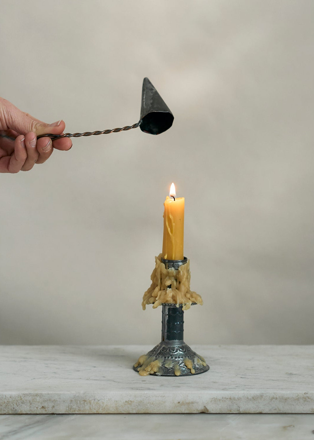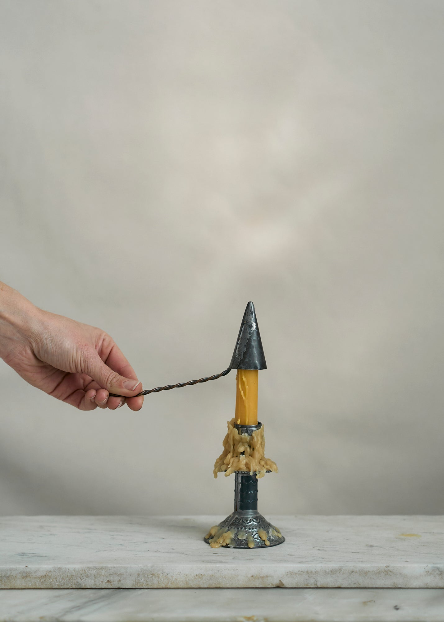 Handmade metal folk art candle snuffer. A unique vintage piece to not just add to your decor but to use with candles throughout your home.