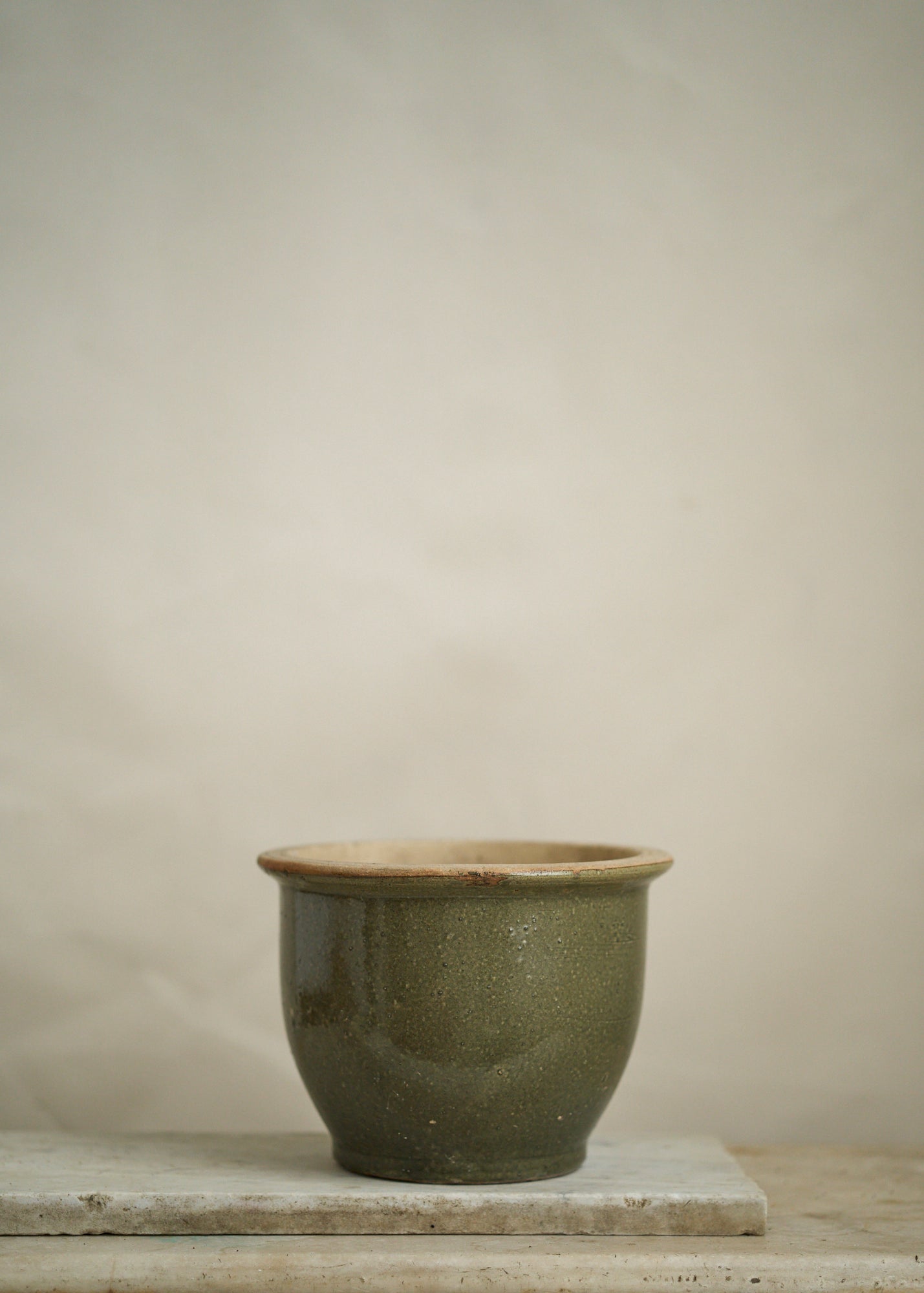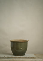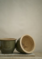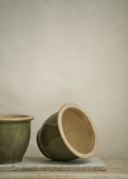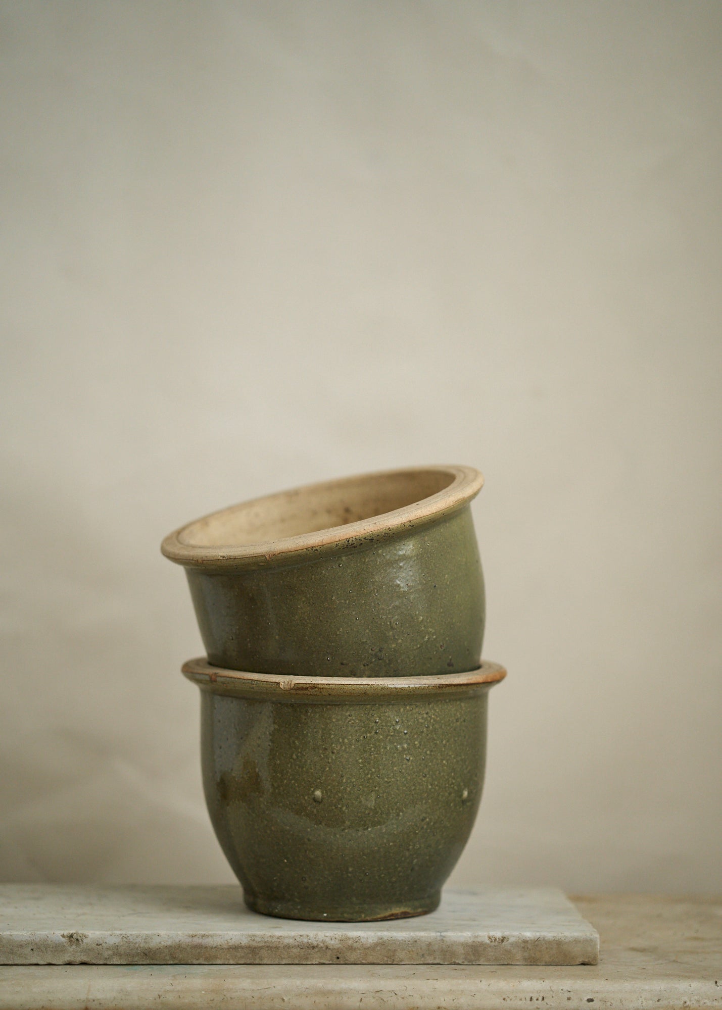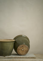 Vintage sage green ceramic planter with ivory trim. Perfect for your favorite potted plant either indoors or outdoors. Two available.
