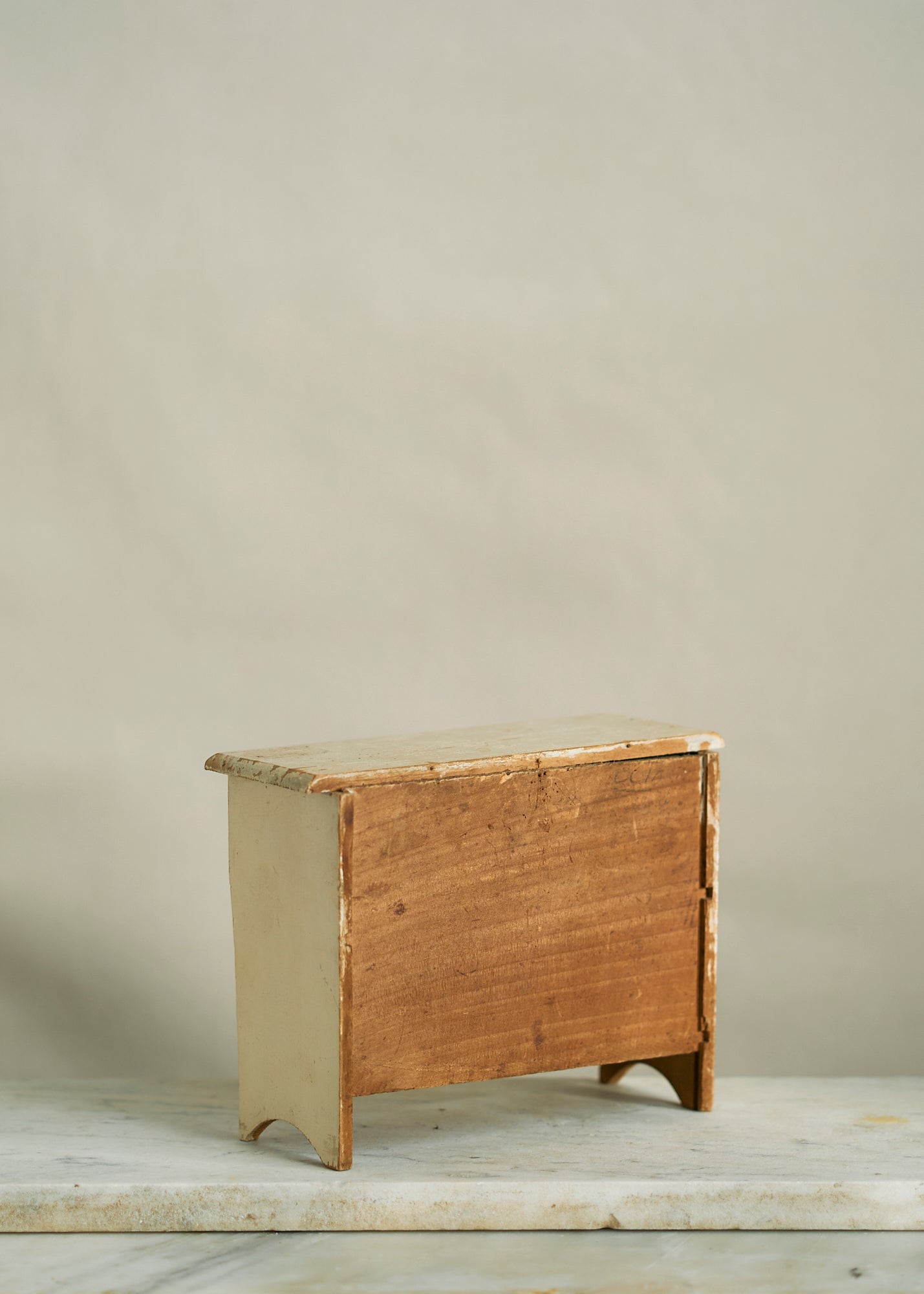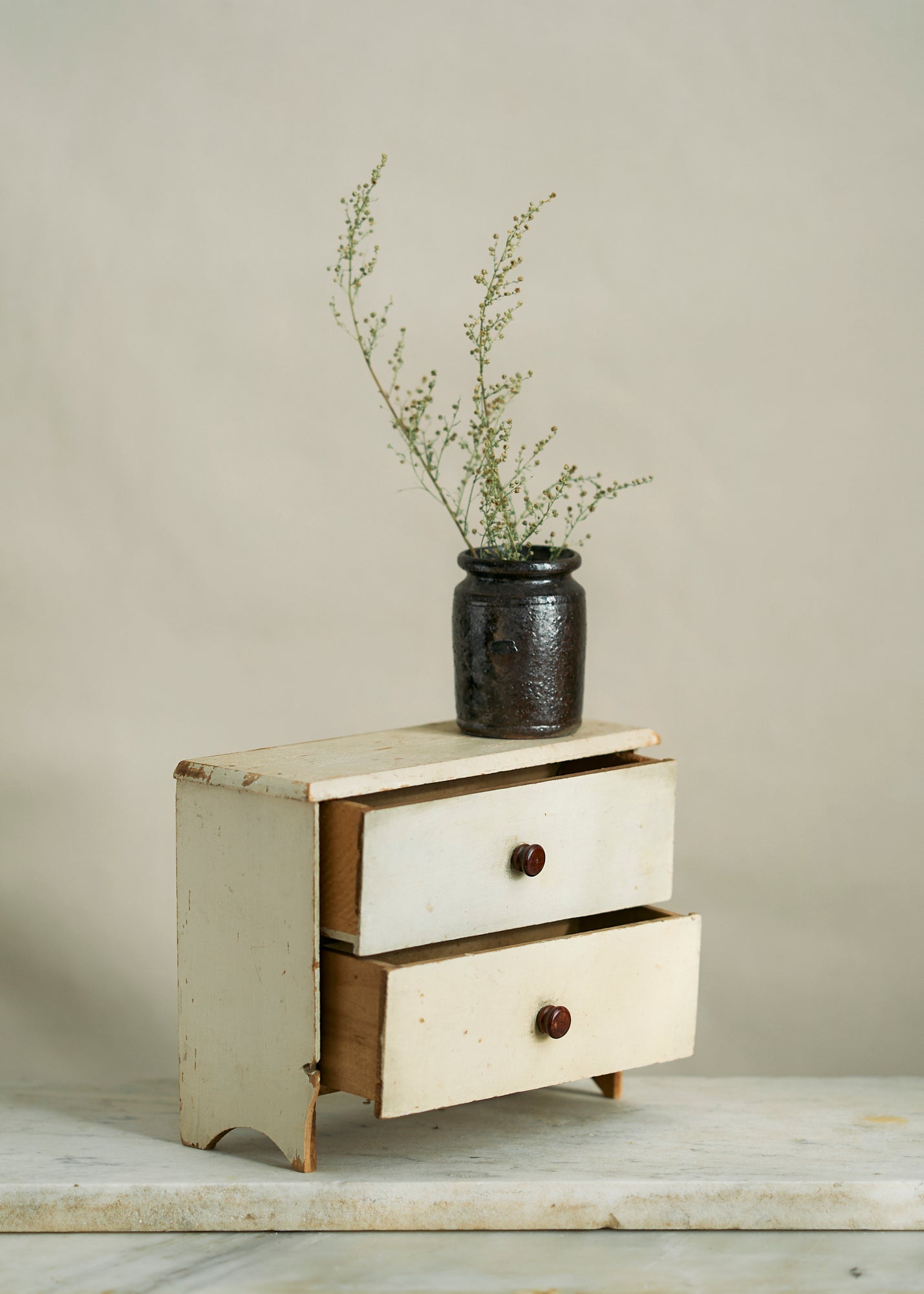 A wonderful little jewelry box or small set of wooden drawers for a tabletop. Painted white with dark red painted knobs. Store your most prized pieces or use in the kitchen or bathroom to hold small necessities.