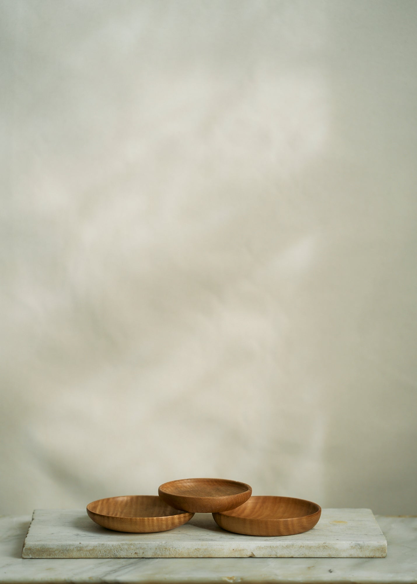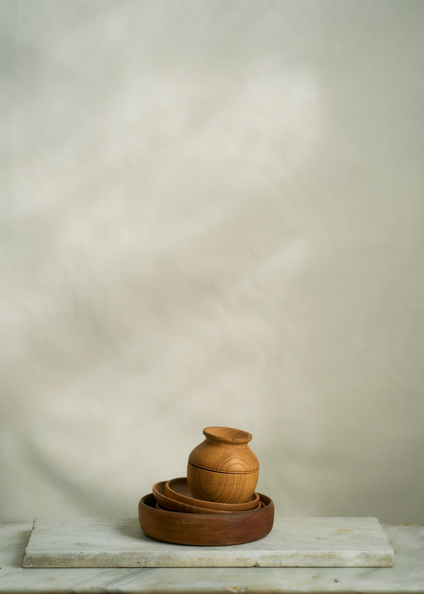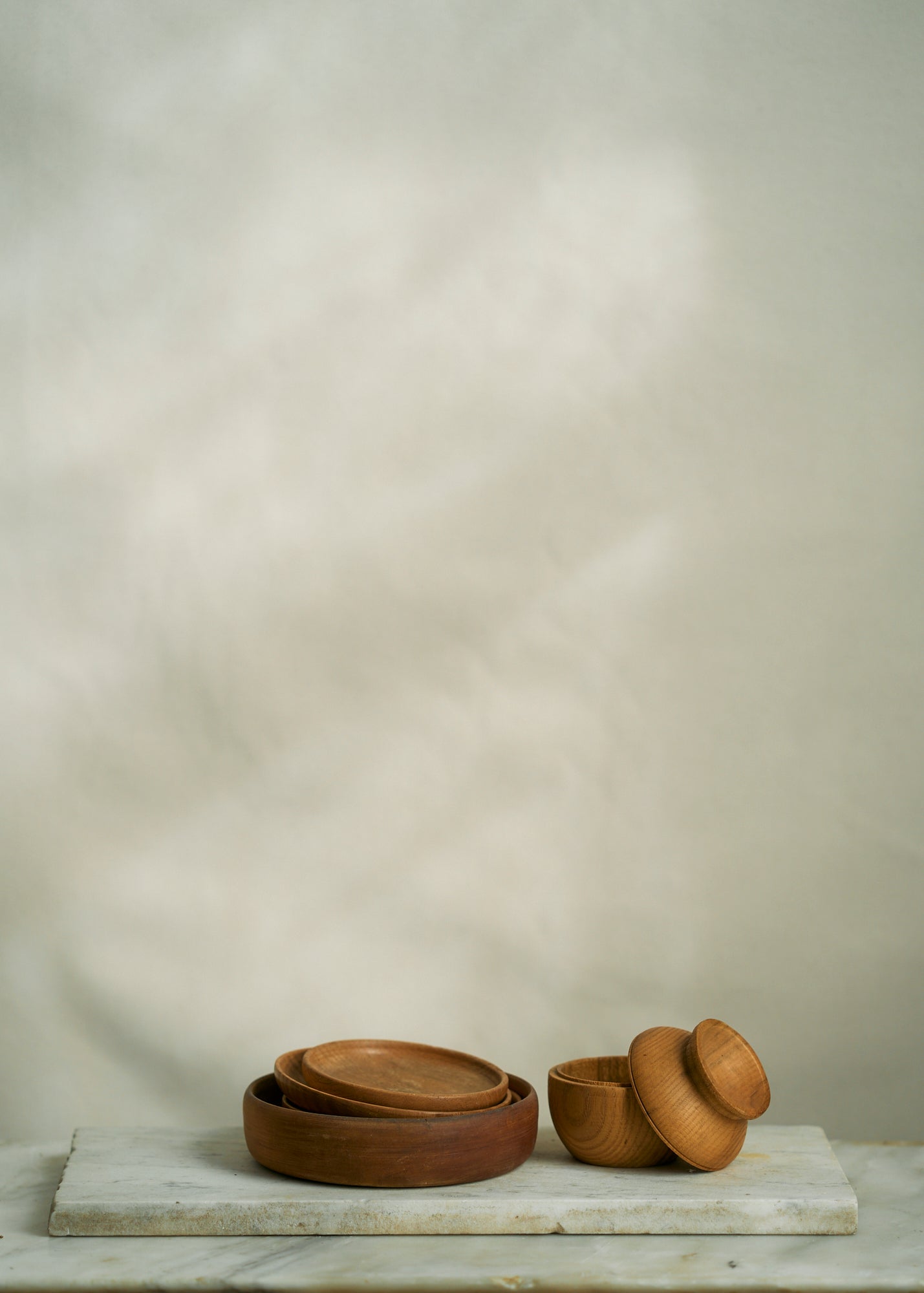 A collection of vintage wooden kitchen items including one storage container, three wooden plates, and one wooden bowl. Sold as a lot.
