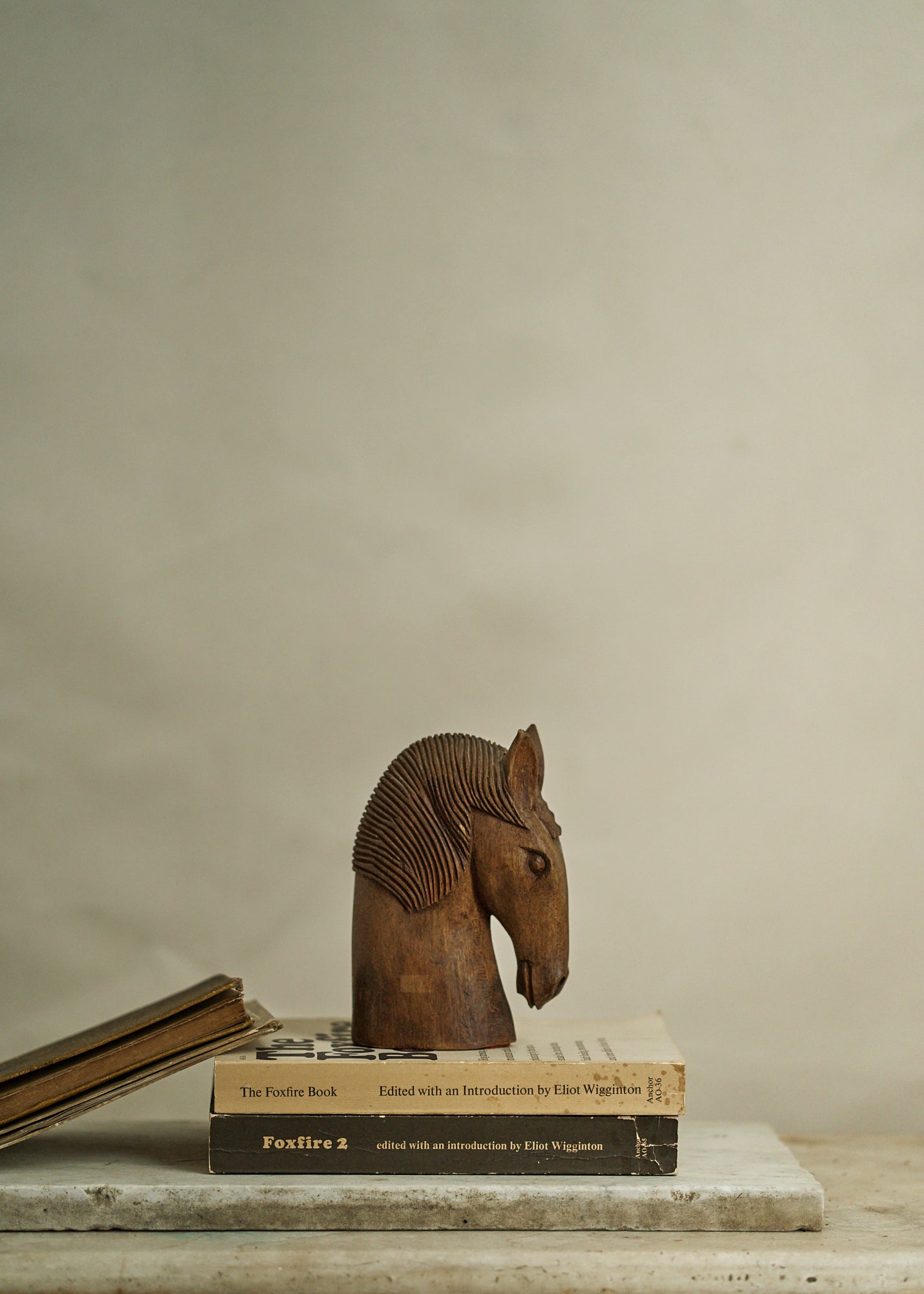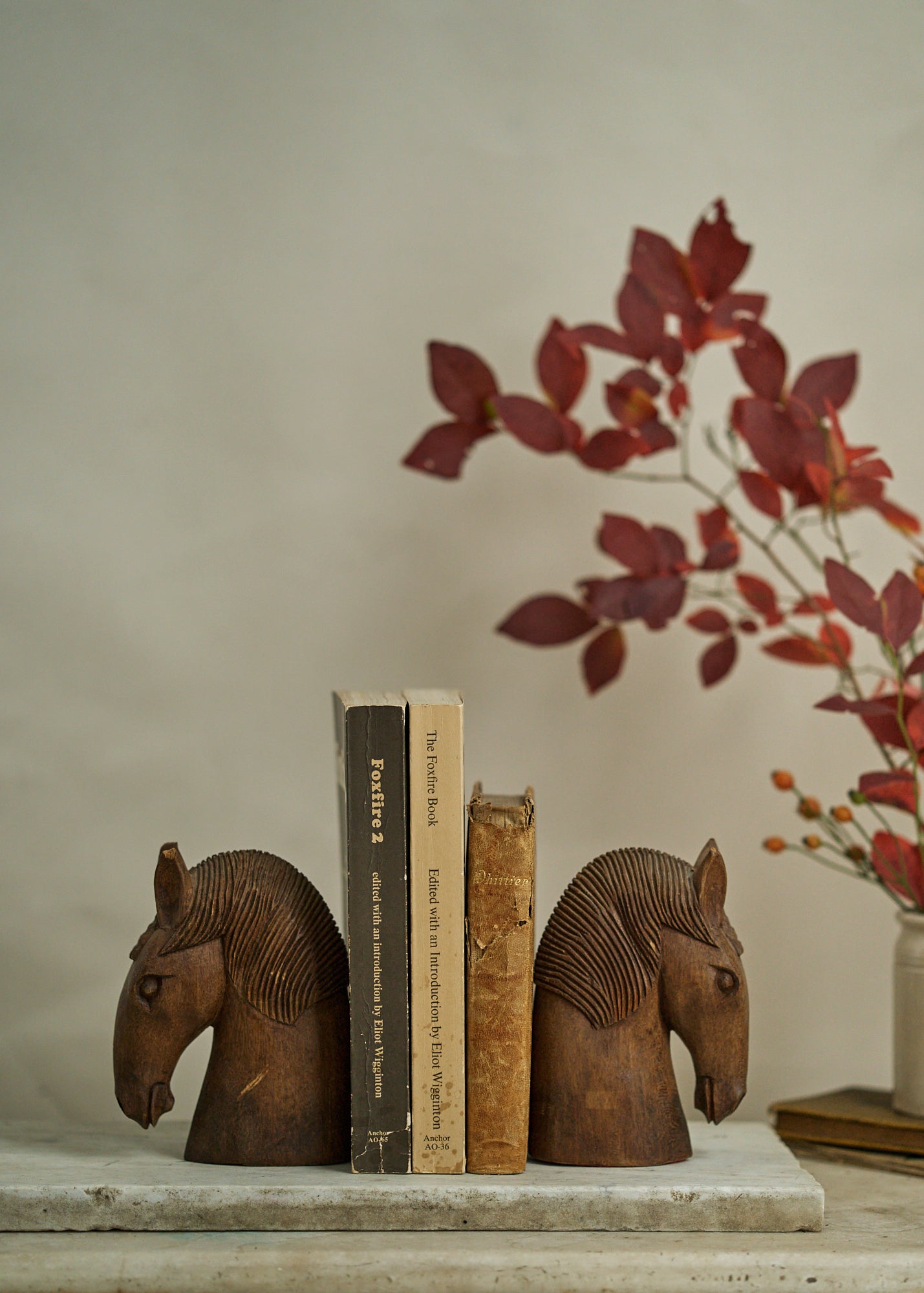 Gorgeous hand carved vintage wooden horse head book ends. Sold as a set.