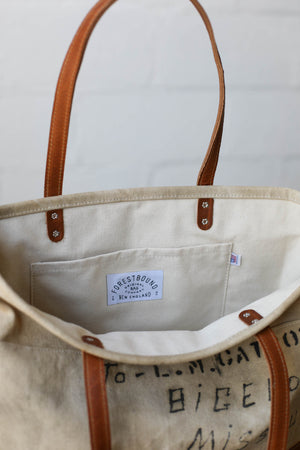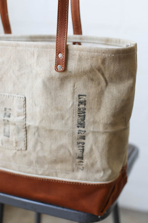 Durable, worn in canvas salvaged from a WWII era USN sea bag has been thoughtfully reworked into a versatile tote bag that's perfect for everyday use.